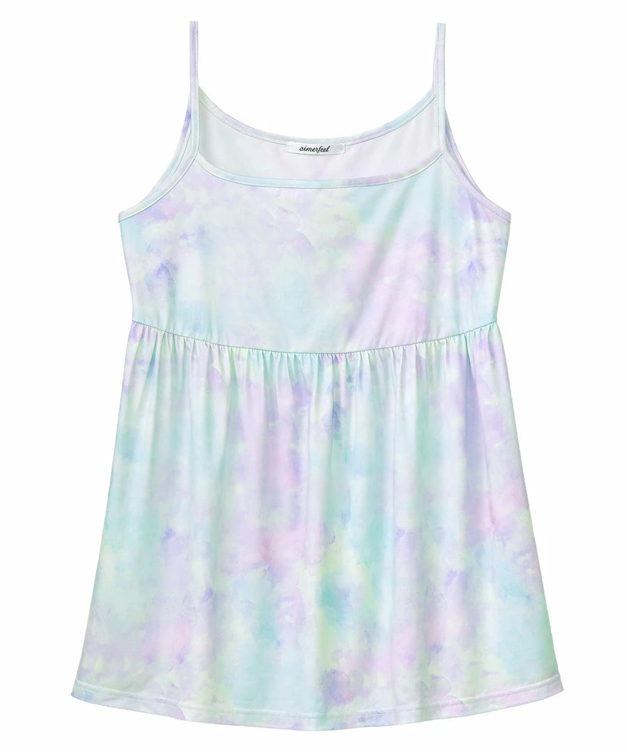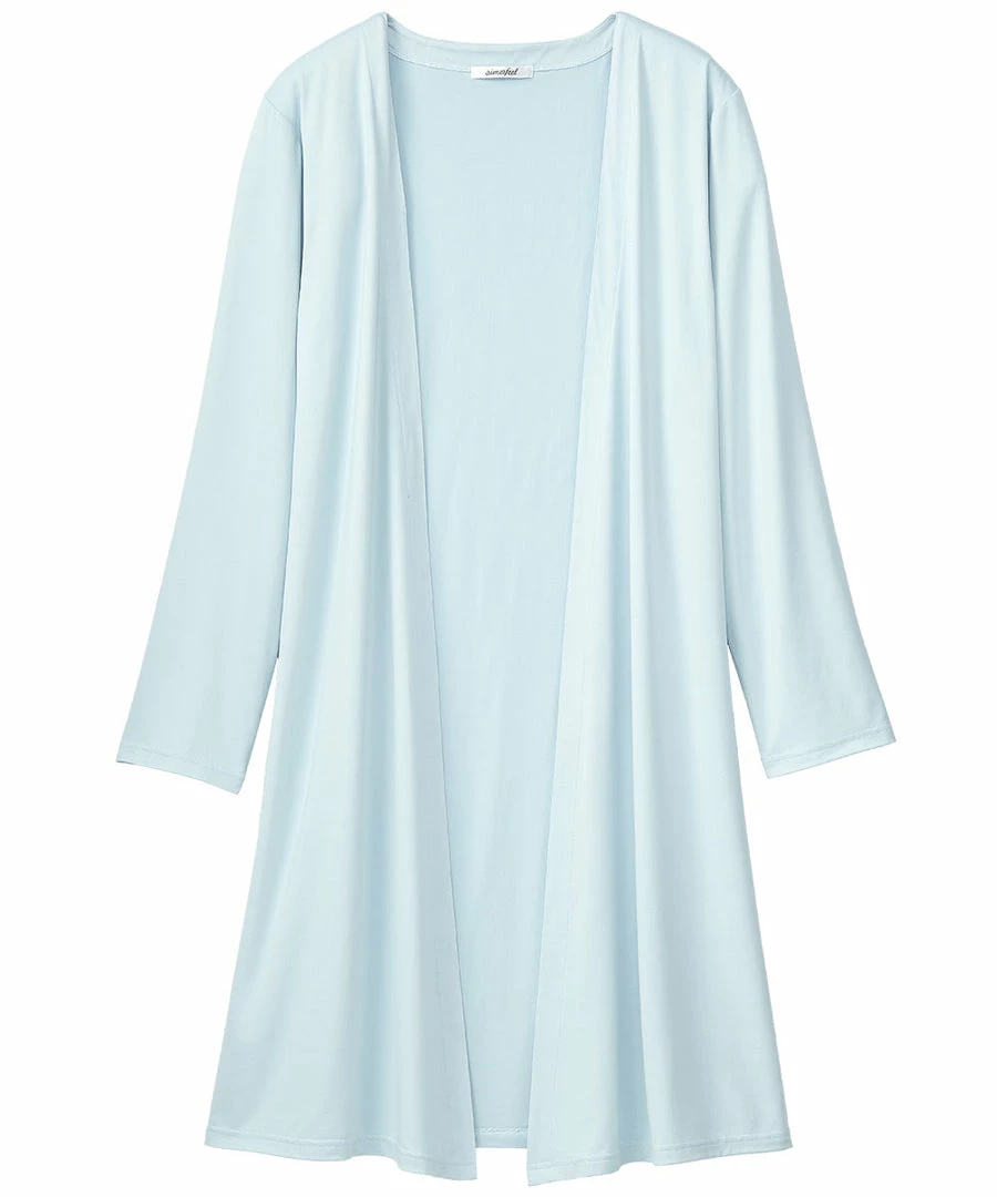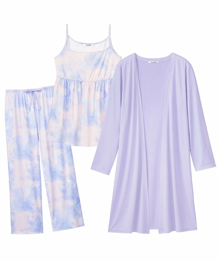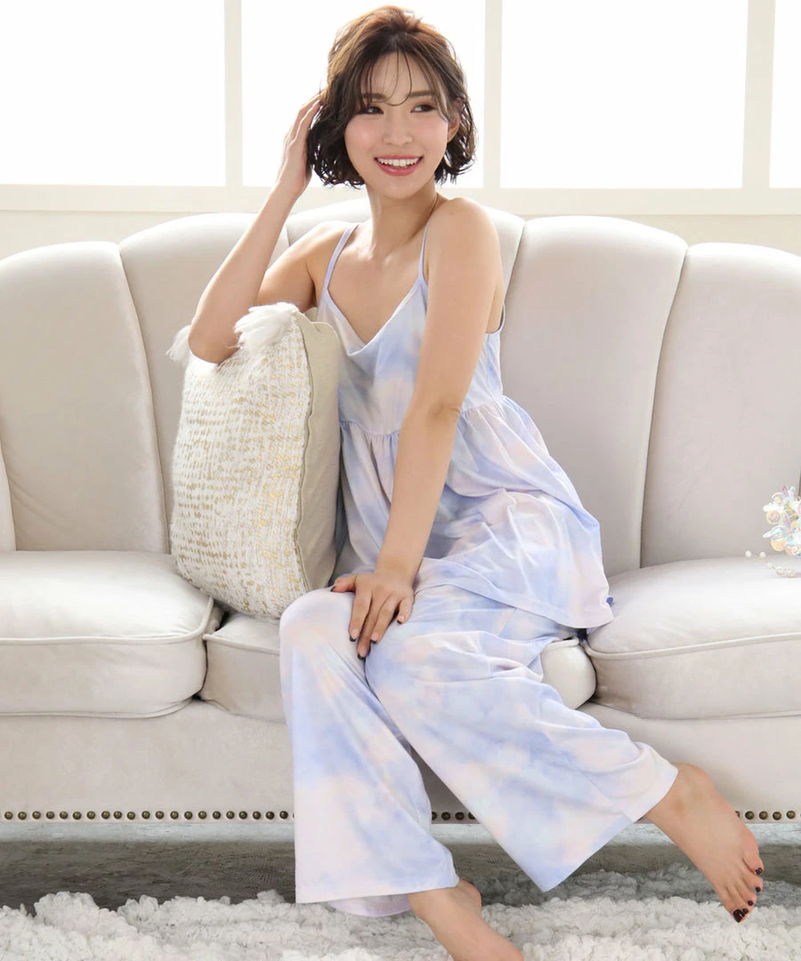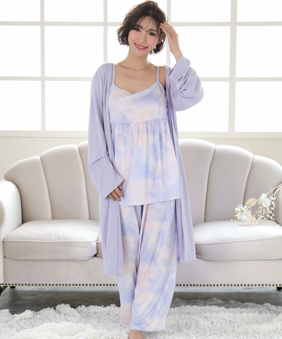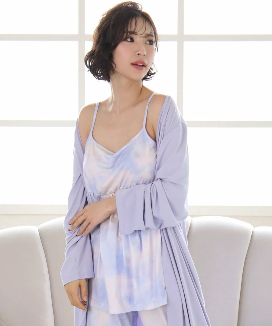 A mature yet cute three-piece room wear set with beautifully pale colors resembling a watercolor painting. It feels smooth and slippery on the skin and its stretchy material makes it perfect for wearing at home or when relaxing! The cardigan is made of a thin material, so it is great for when you want to quickly slip it on. The loose and long length makes your vertical silhouette look beautiful. Each piece in the three-piece set can be matched with other items as well, making them convenient.