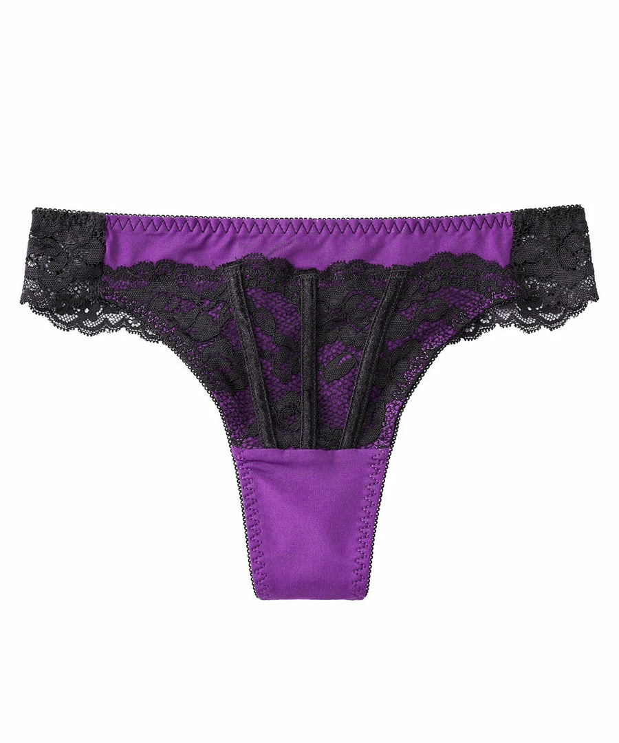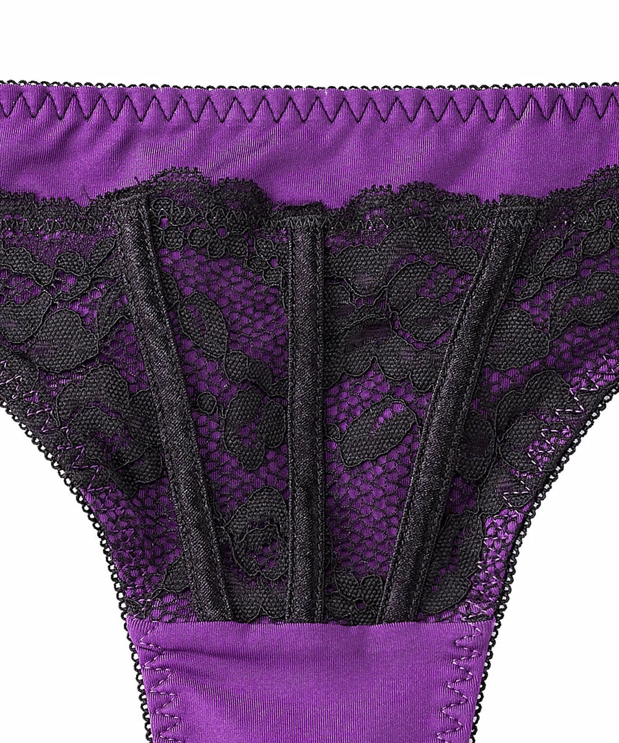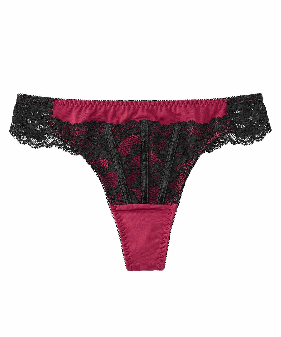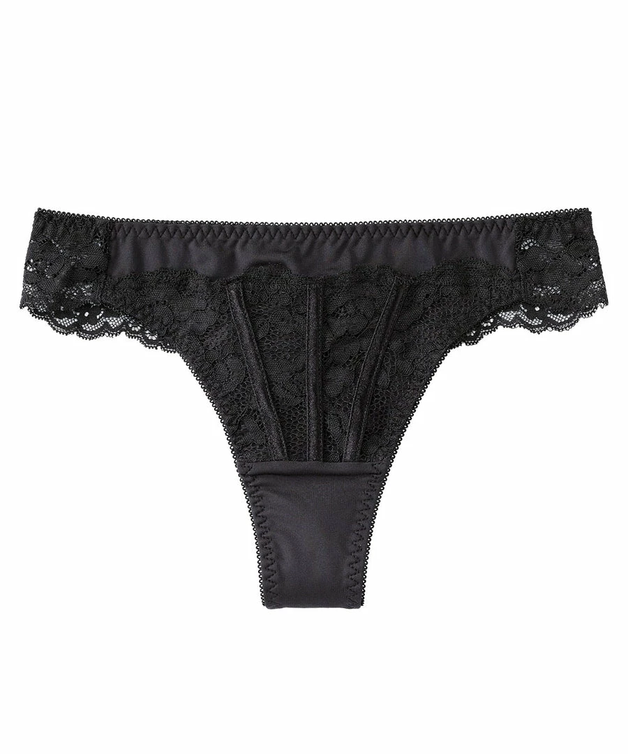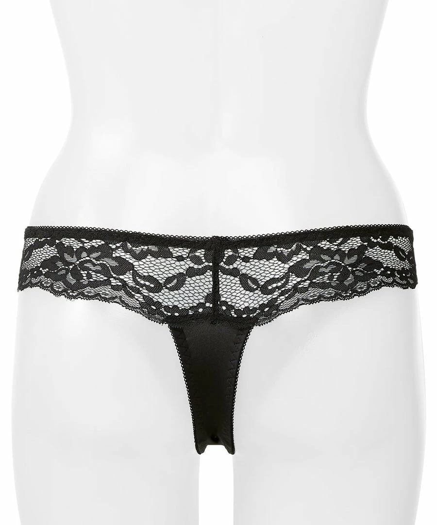 Adult sexy thong panty with a design that incorporates lines over black lace.