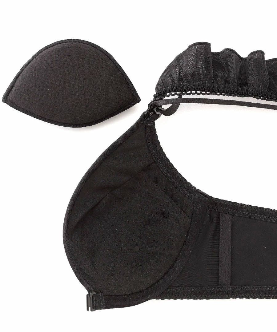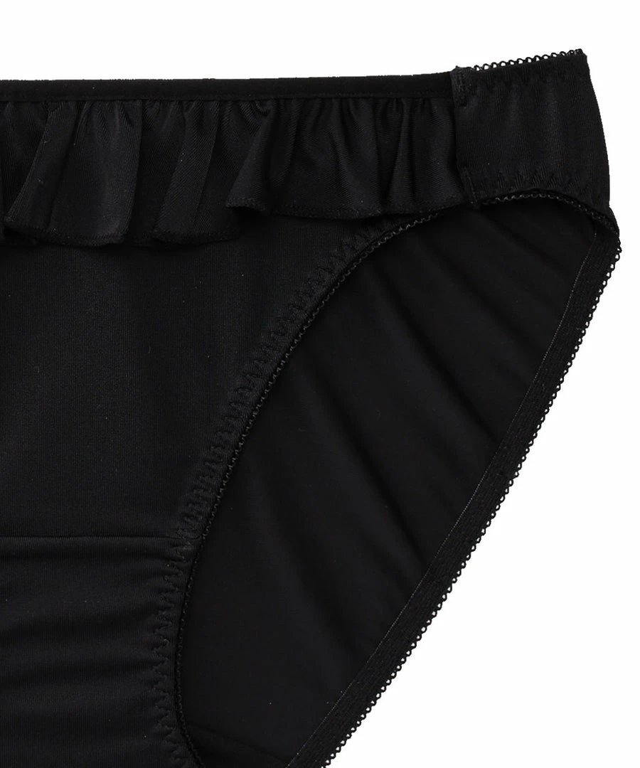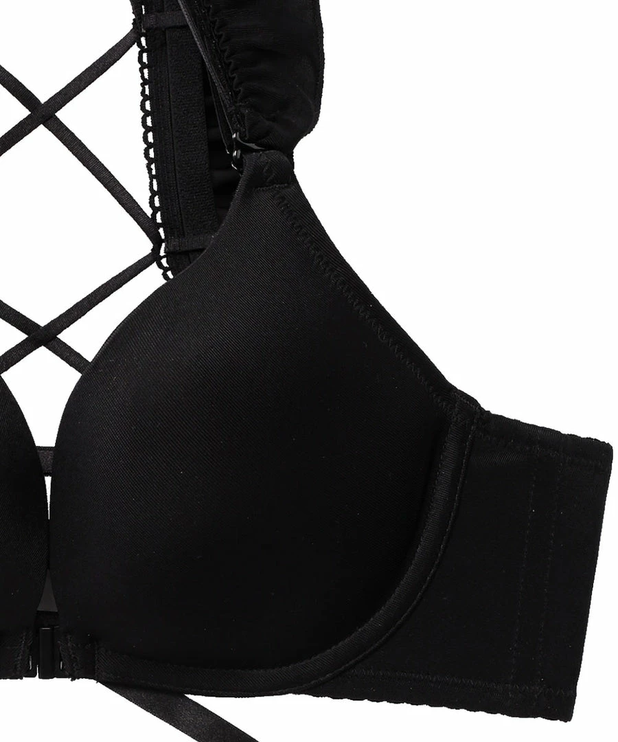 Ideal for wearing with backless fashion outfits, where you boldly show off your back. The front hook, frilled straps and cross design on the back create a fashionable and impressive look for your back. This 2-way type bra has removable frills on the straps so that, depending on your mood, you can also enjoy it as a simple and easy-to-use seamless design. The wire on the cups is L-shaped, showing your cleavage from top to bottom, which is quite sexy. The front of the panty is also decorated with casual frills, giving it a natural cuteness.