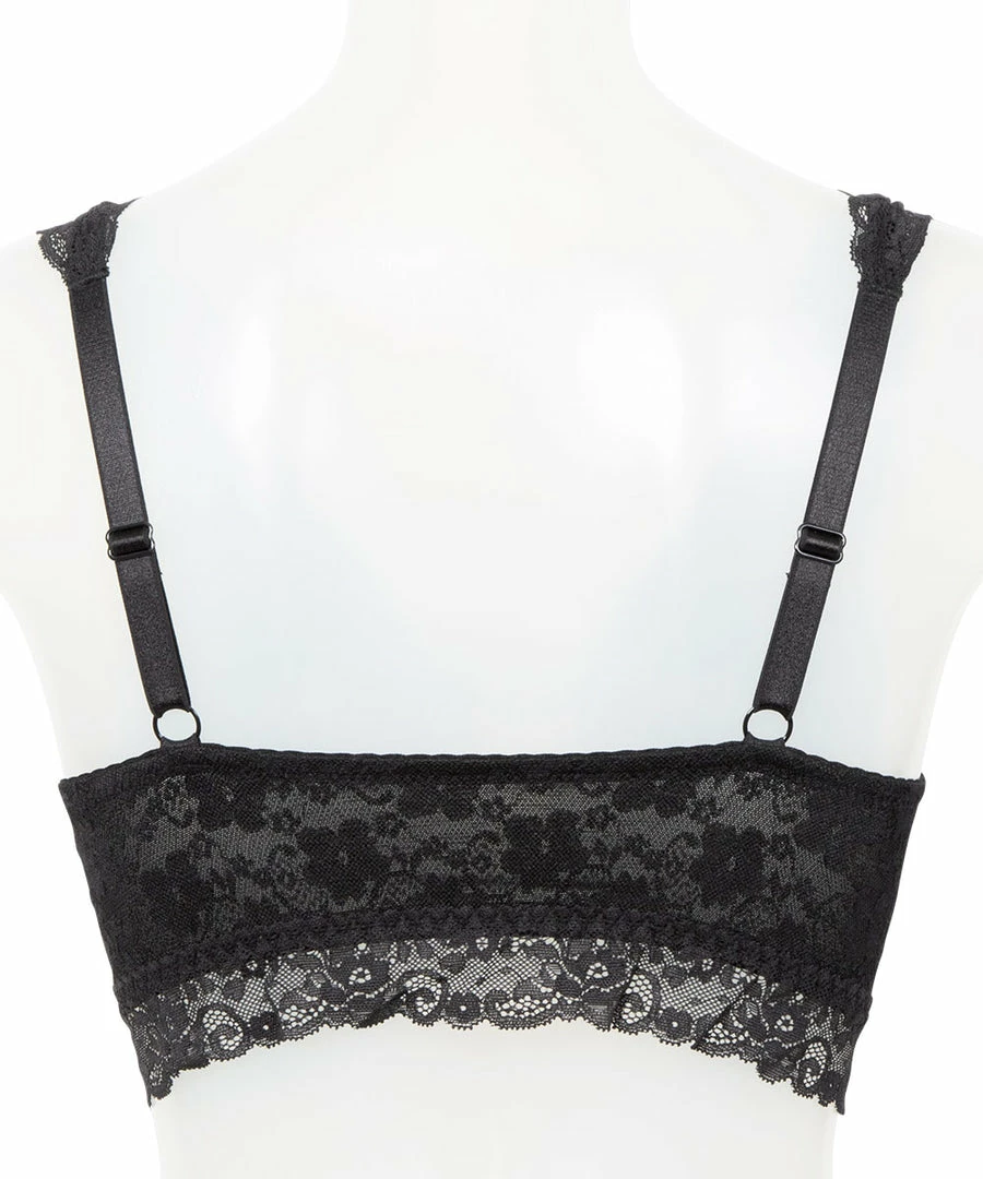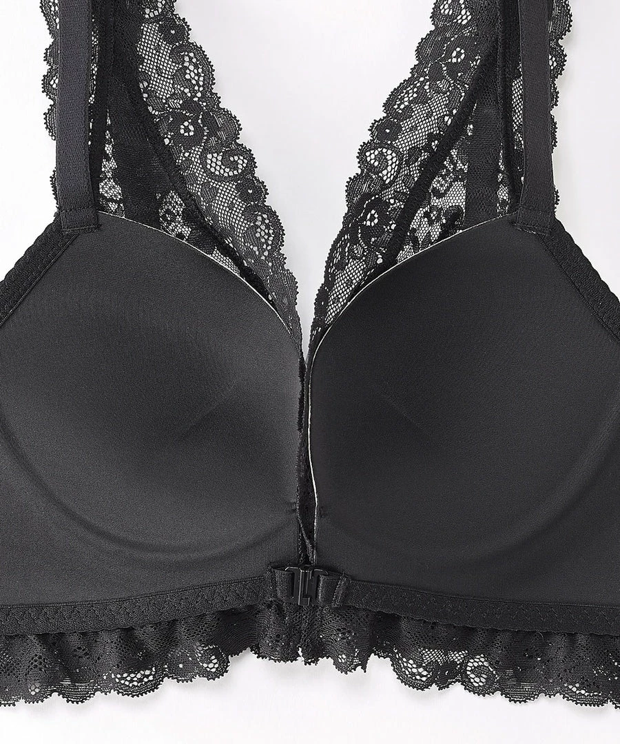 The wireless Maximum Boost Bra (R), which is popular for its ability to enlarge the bustline even with the absence of wires, is now available as front closing bras! The flower print lace fabric and ruffle lace on the hems make it adorable while the slightly see-through design adds a fabulously sexy impression. This wonderful bra has a front hook that pulls your breasts up from the sides, creating a beautiful cleavage just by wearing it. In addition, the soft and thick bottom pads will add volume to the breasts and enhance the cleavage. It has a very sexy sheer design, so it is highly recommended for those looking for a bra that has both a trendy design and the ability to enlarge the bustline.