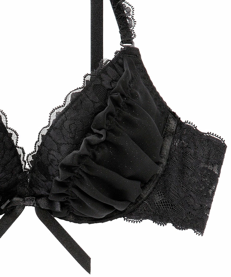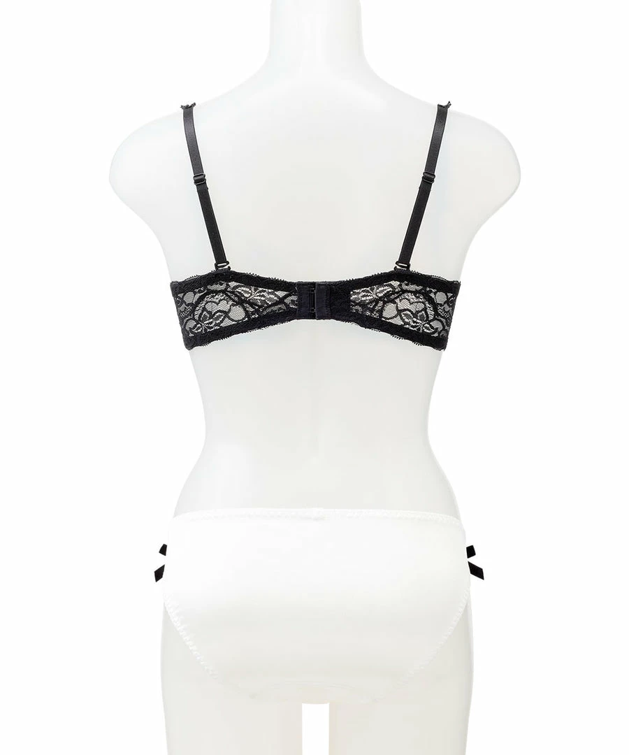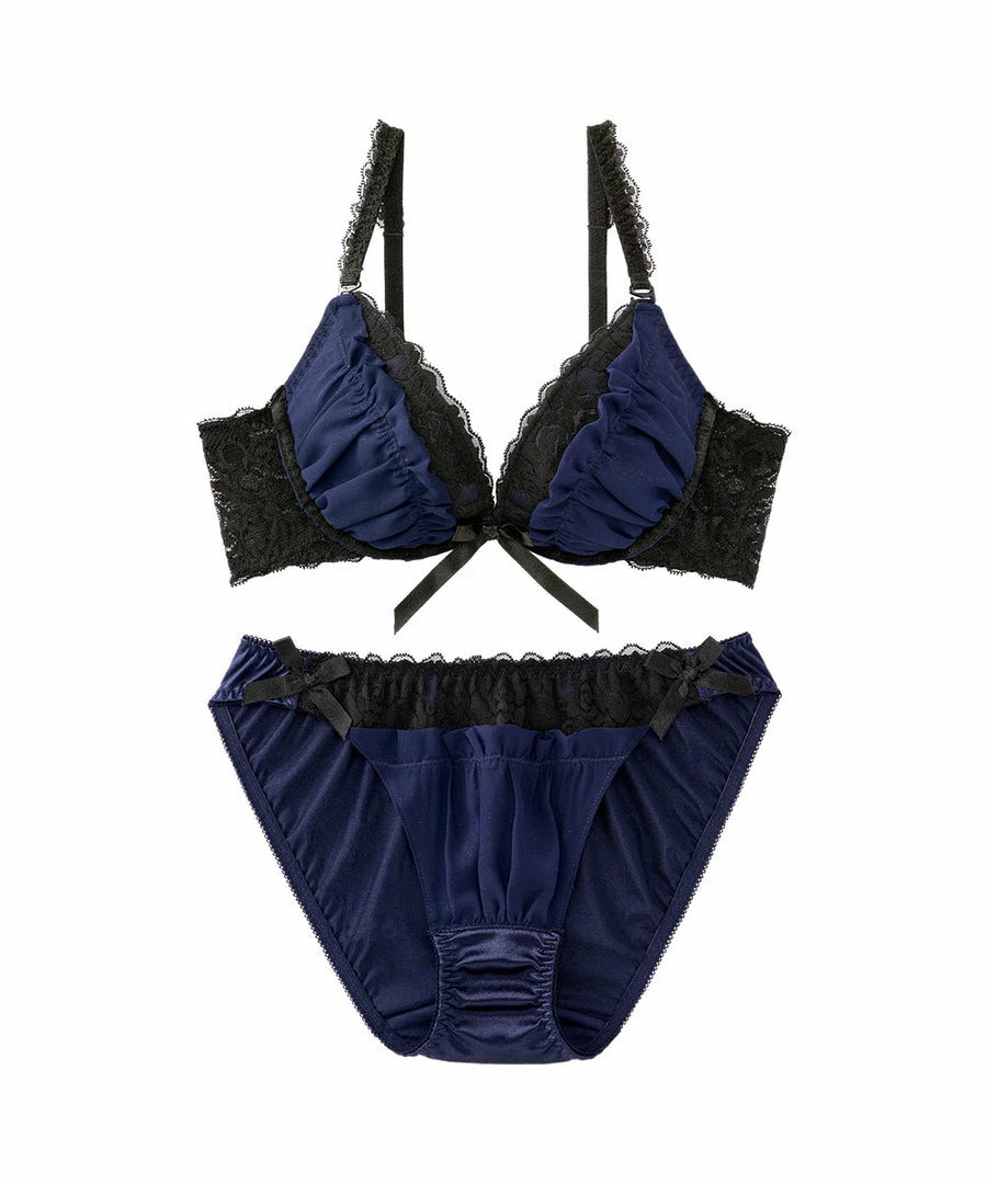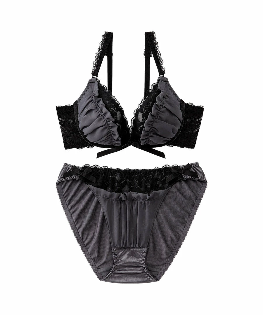 A feminine Bra Panty Set that you would love! With a low front center and original L-shaped wire and cup pattern, it lifts away from the sides and enhances your cleavage! A feature is how the all-lace side straps do not dig into the underarms or back. The cups have a charming design that uses a soft chiffon fabric with plenty of metallic fabric.
