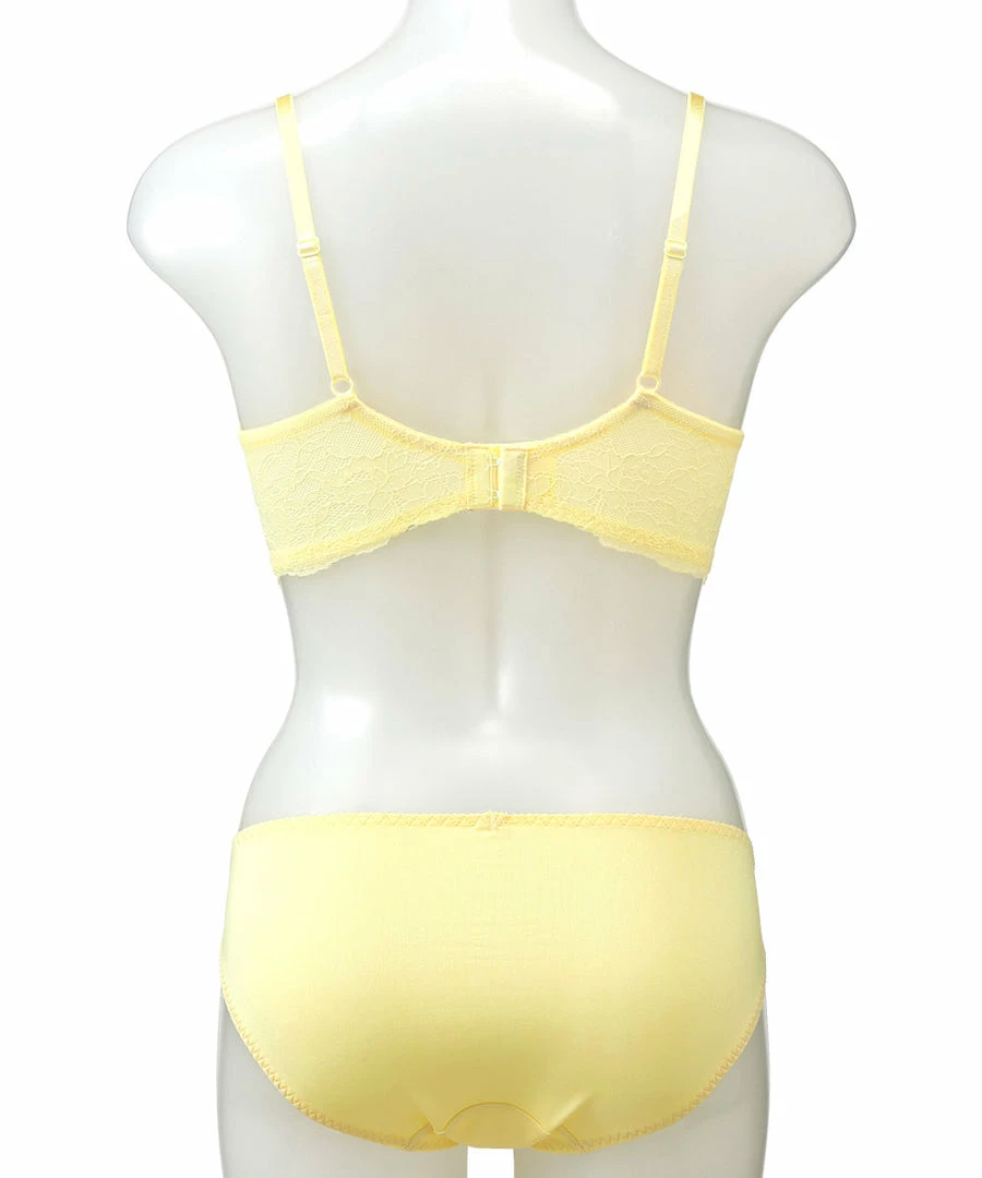 Design featuring a mimosa print in pale colors and cute frills and ribbons under the cups.