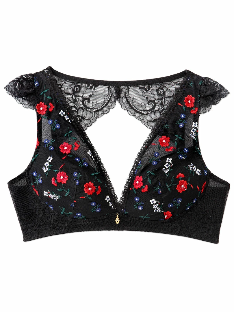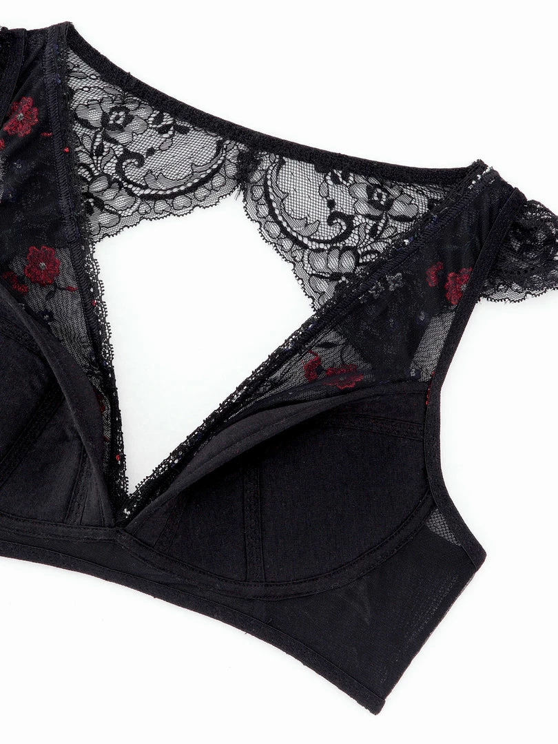 Without any wires, hooks or pads, this relaxing bra is light and comfortable. The cups are designed to create a beautiful silhouette, even without wire! While floral embroidery and a frill design on the shoulder convey feminine cuteness, bold transparent lace from the top of the cup to the back also gives it a casually sexy appeal. With its fashionable design, it can even be matched with an open-back top and coordinated as a “show-off bra”!