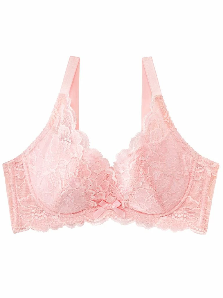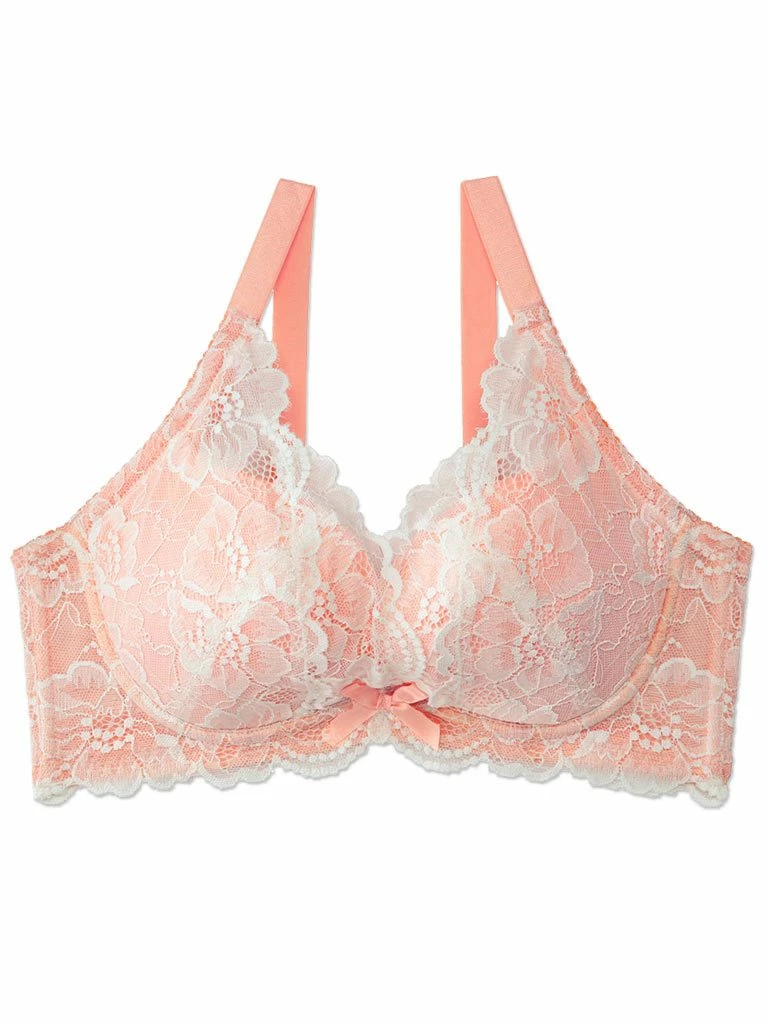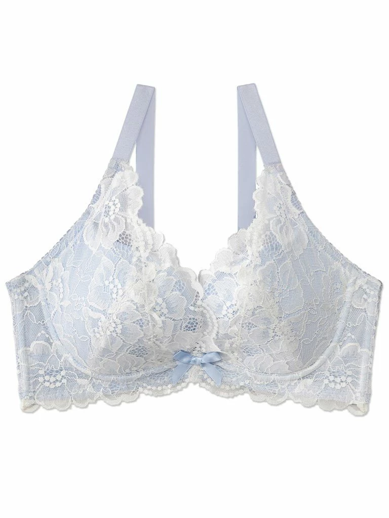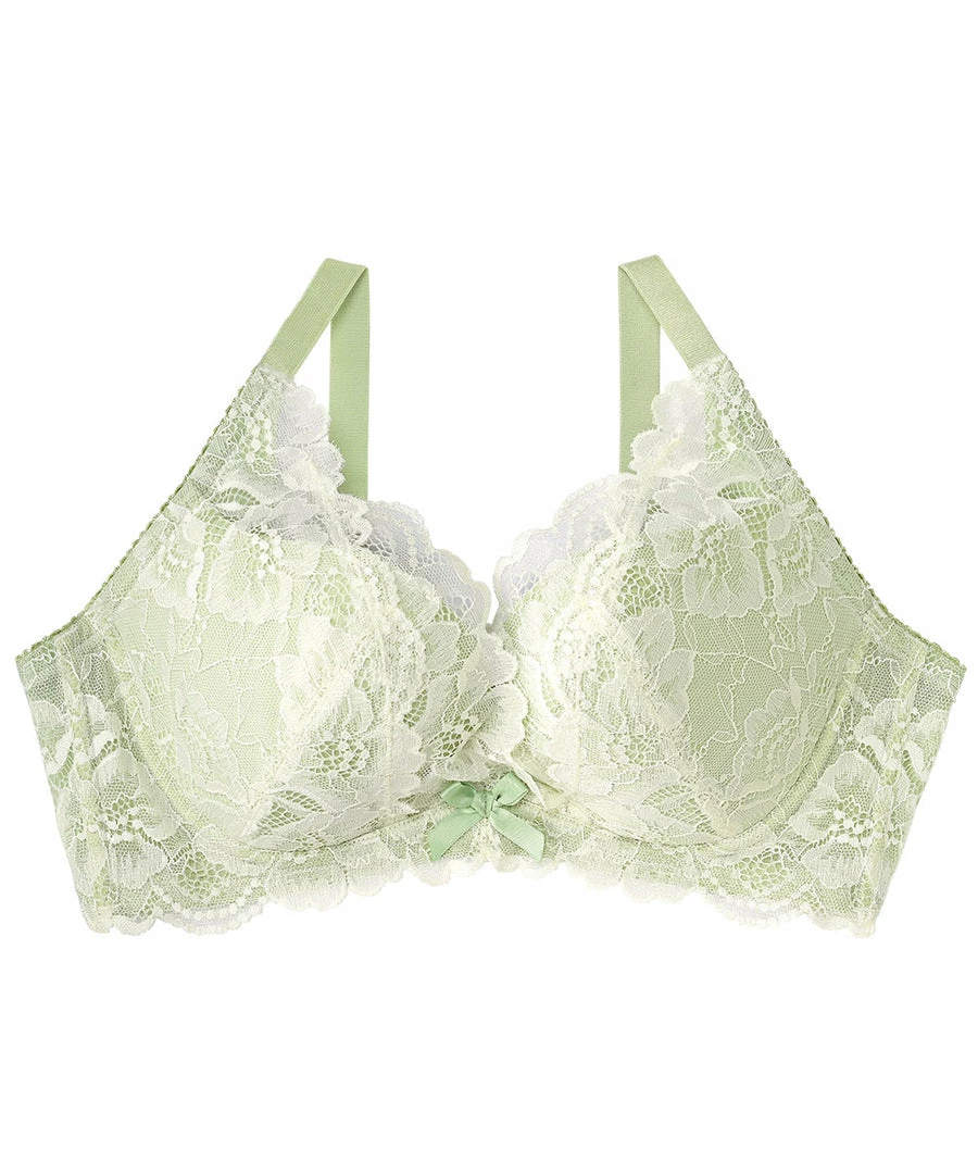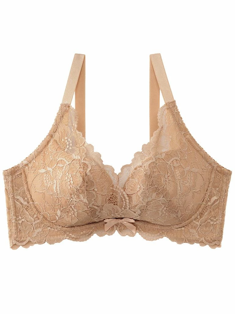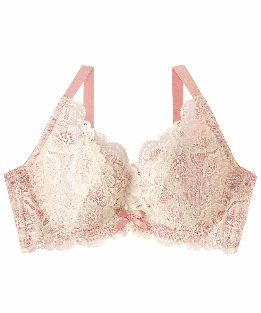 It has layered lace from the cups to the straps, keeping the cleavage in check. The L-shaped underwire is designed for comfort!