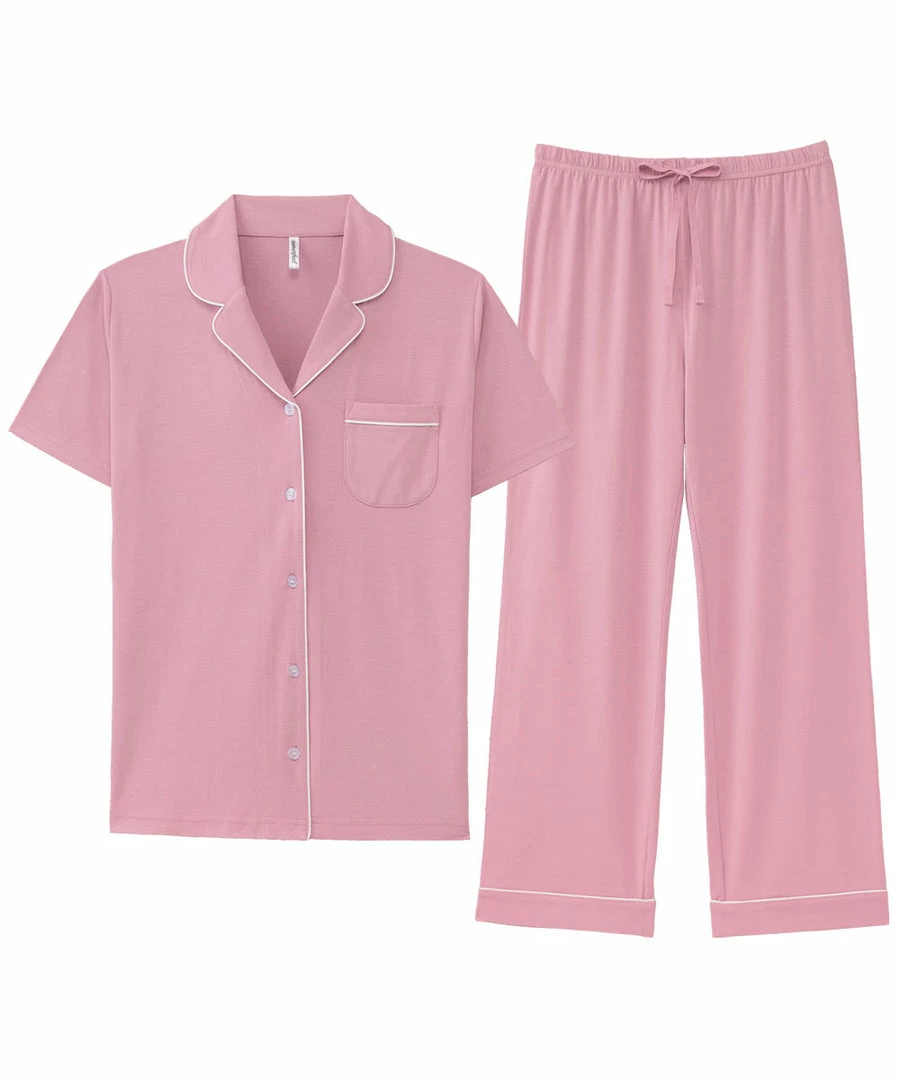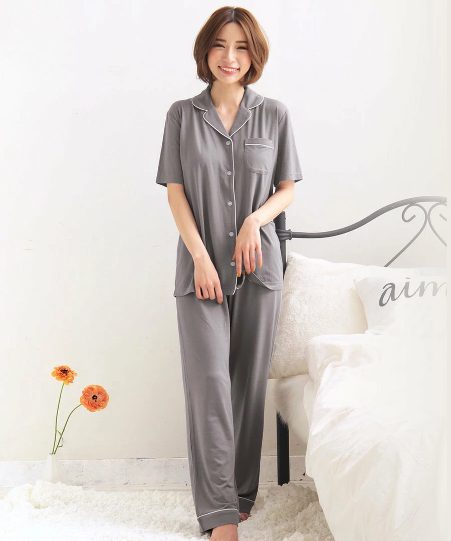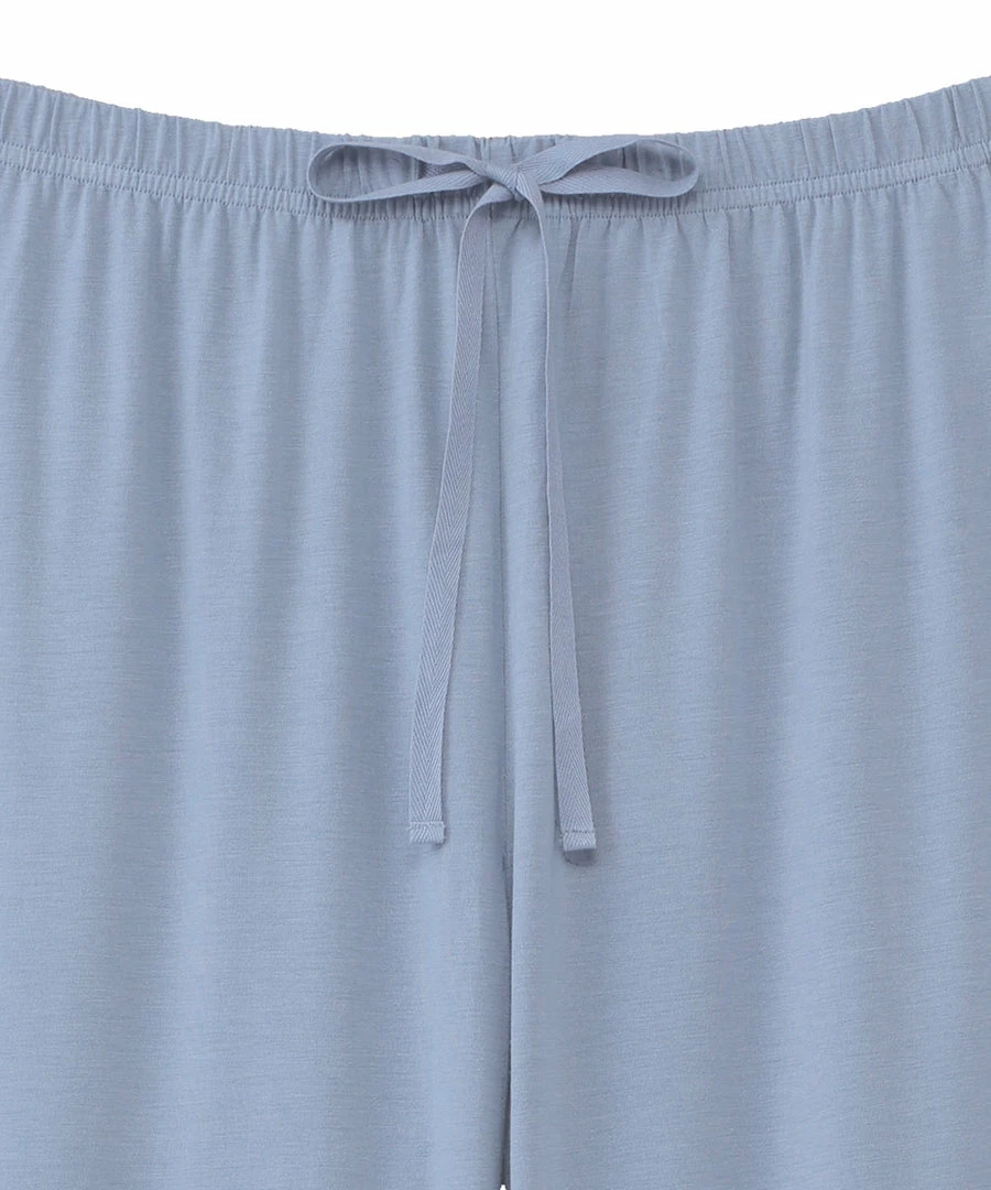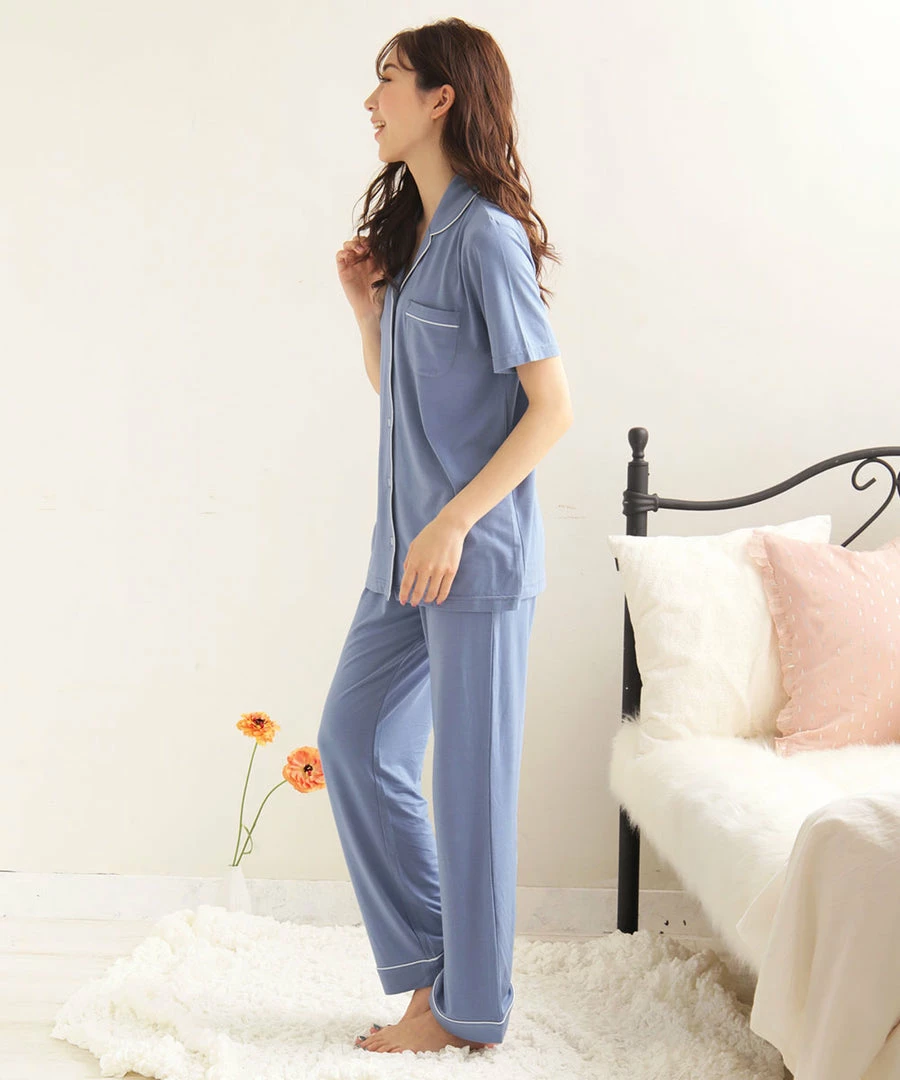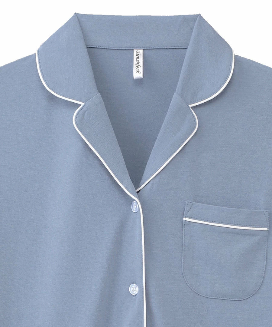 A short-sleeved top and bottom pajama set made with “FEEL COOL® ice”, a cool touch material that is perfect for summer.