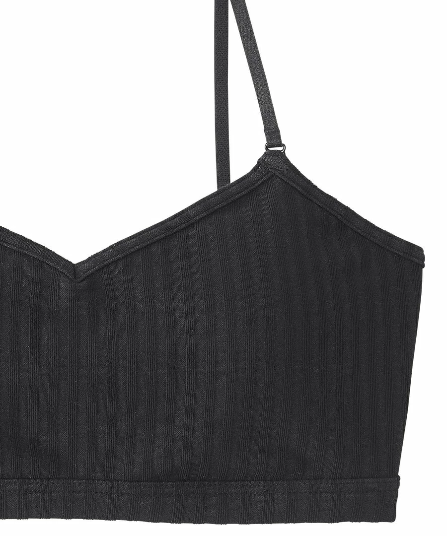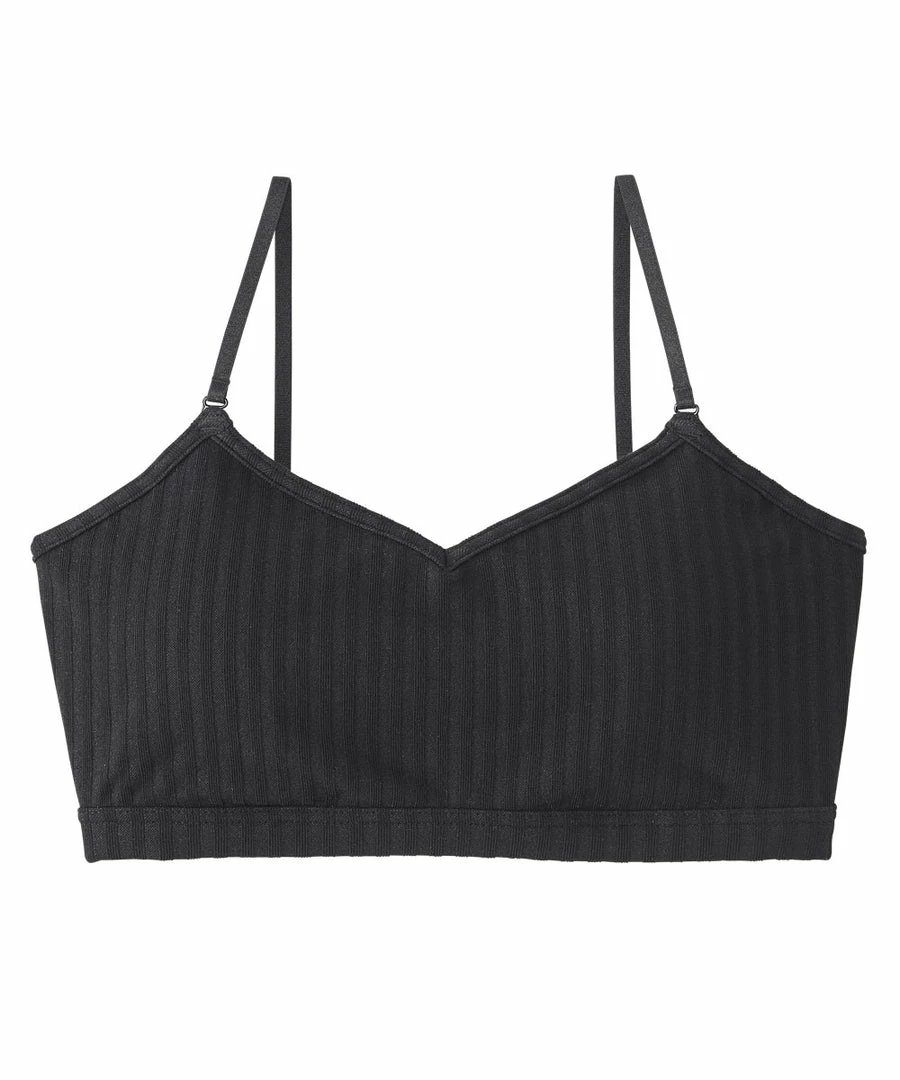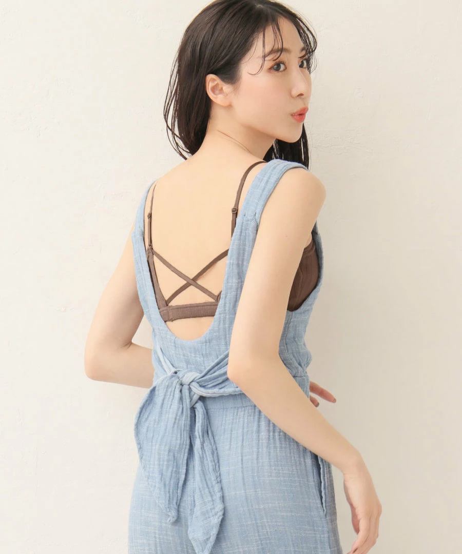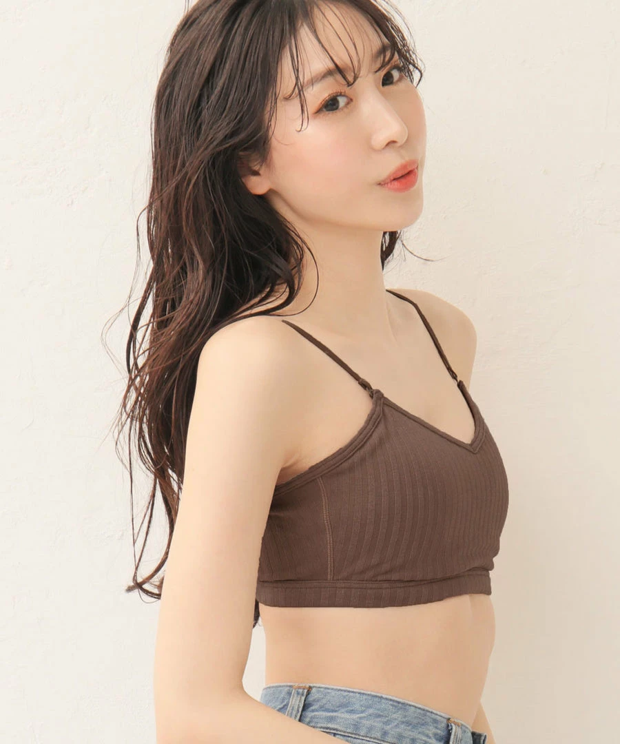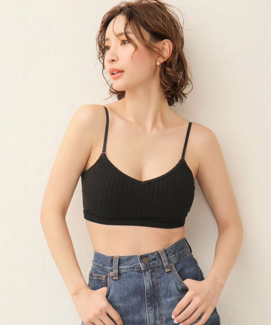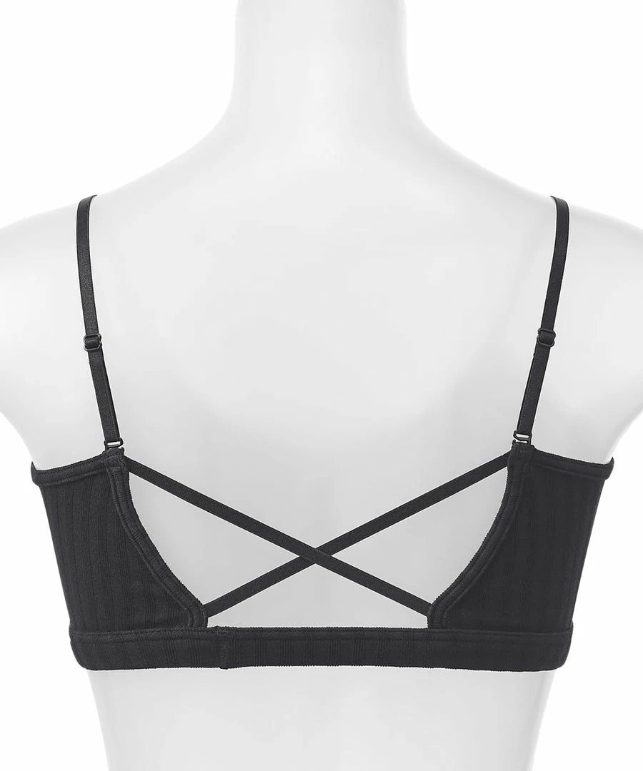 A bralette with cups with a cute, fashionable back. It has no wires, giving it a light and easy fir. It’s made with highly elastic rib material, and has a insert pads for ease of use. The back is wide open, giving it a fashionable look. This piece places particular care in appearance. It can be worn over a top or used to show off some skin with your everyday wardrobe.