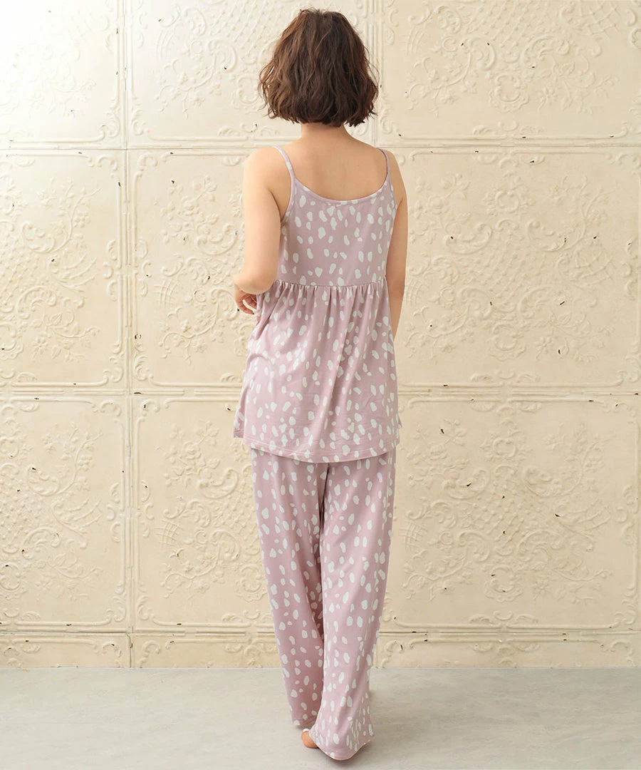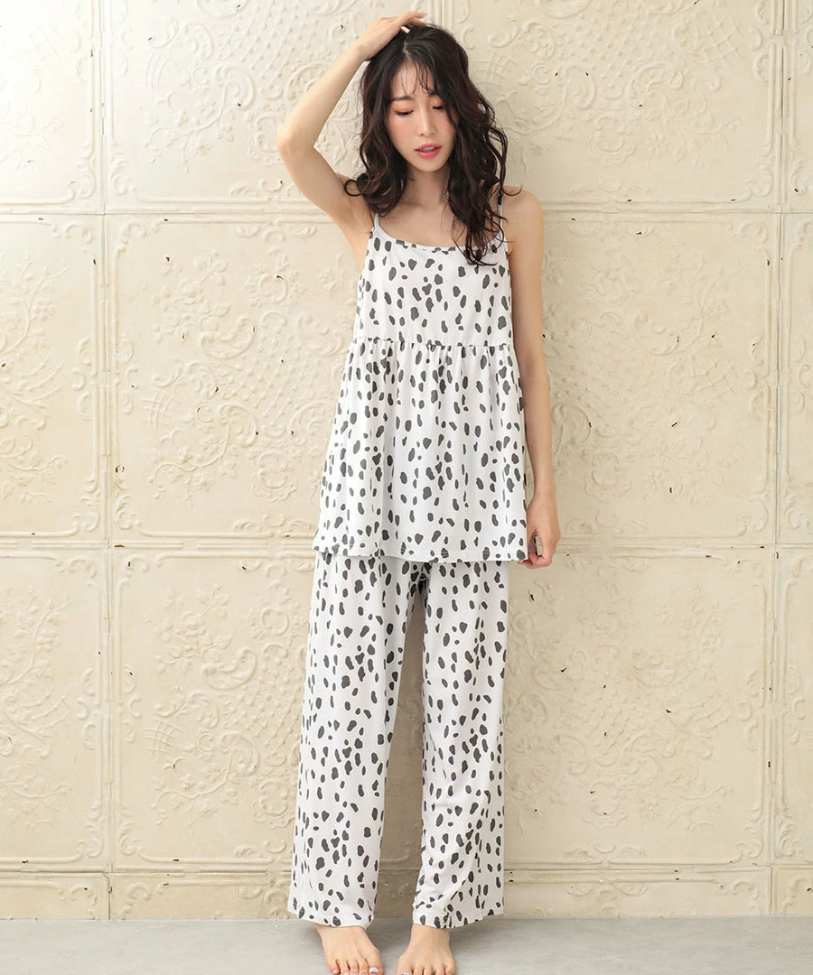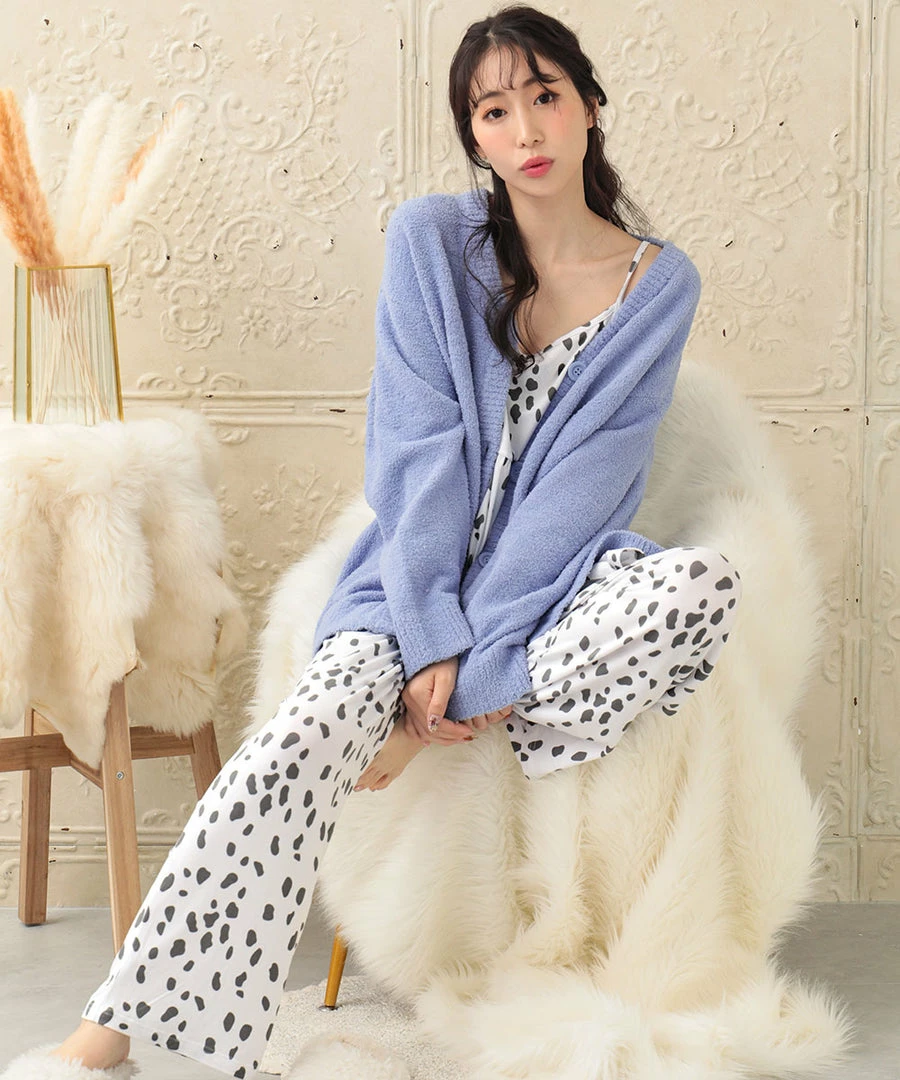 Grown-up but girlish Dalmatian print and trendy smoky colored knit 3 piece loungewear set. Oh so soft and springy fabric makes it perfect for wearing around the house and to relax and unwind! The camisole and long pants are super stretchy.