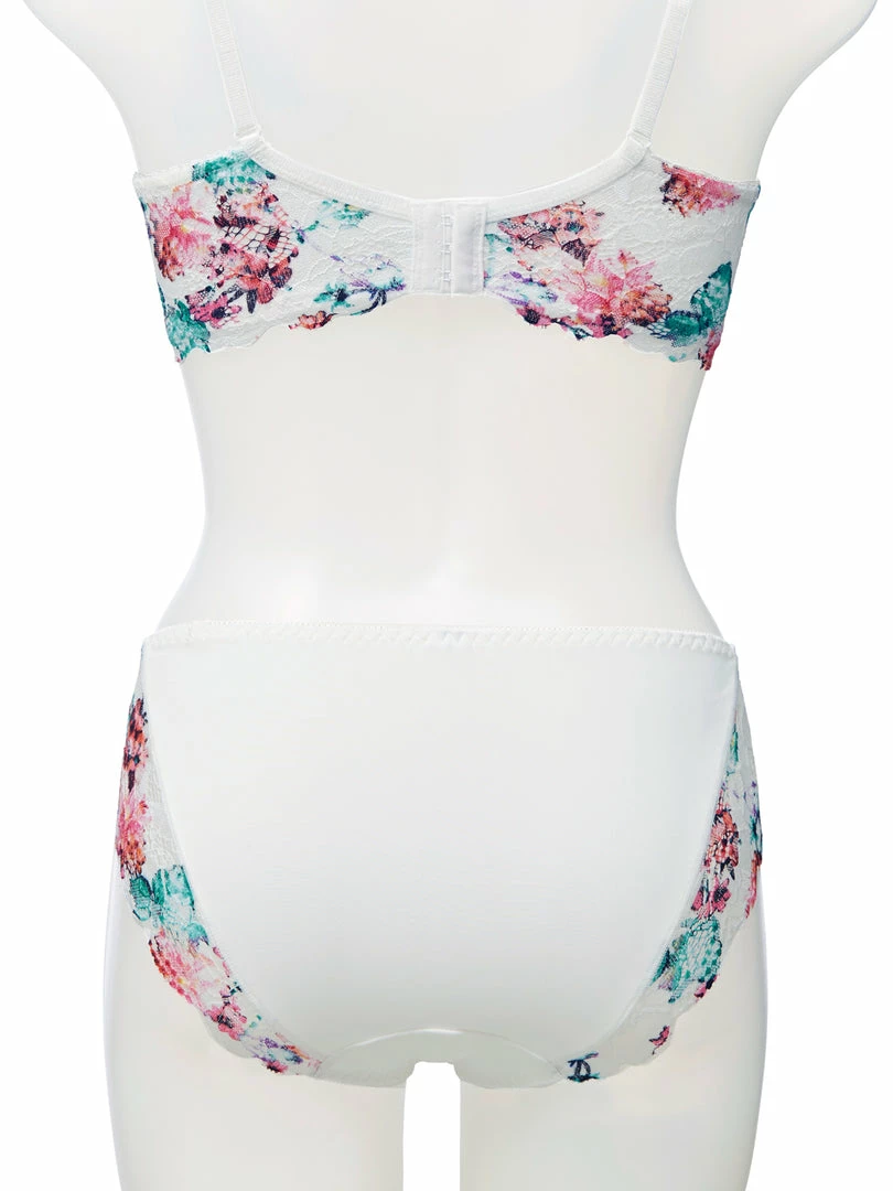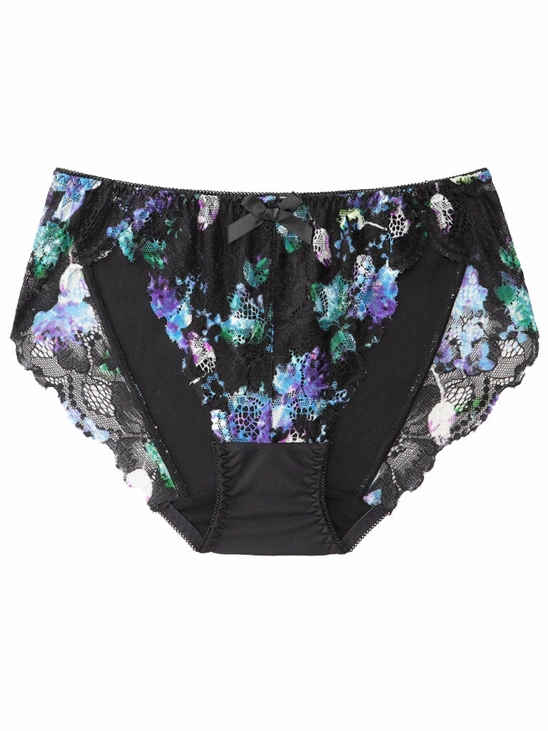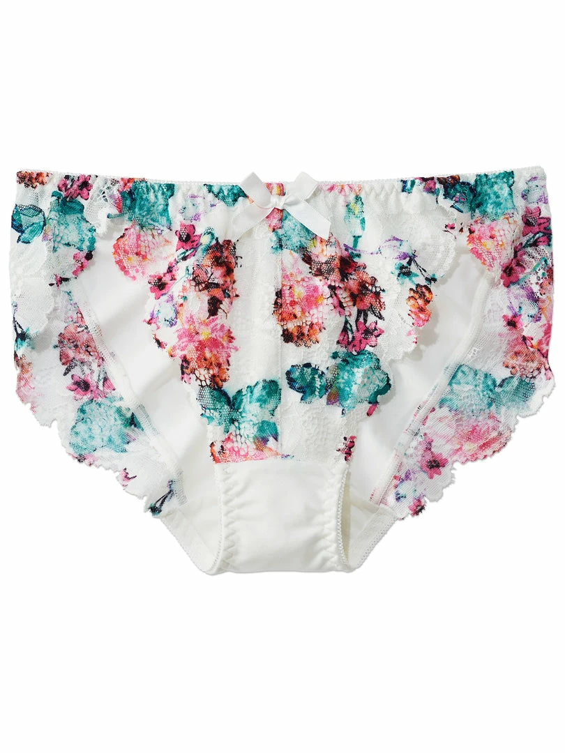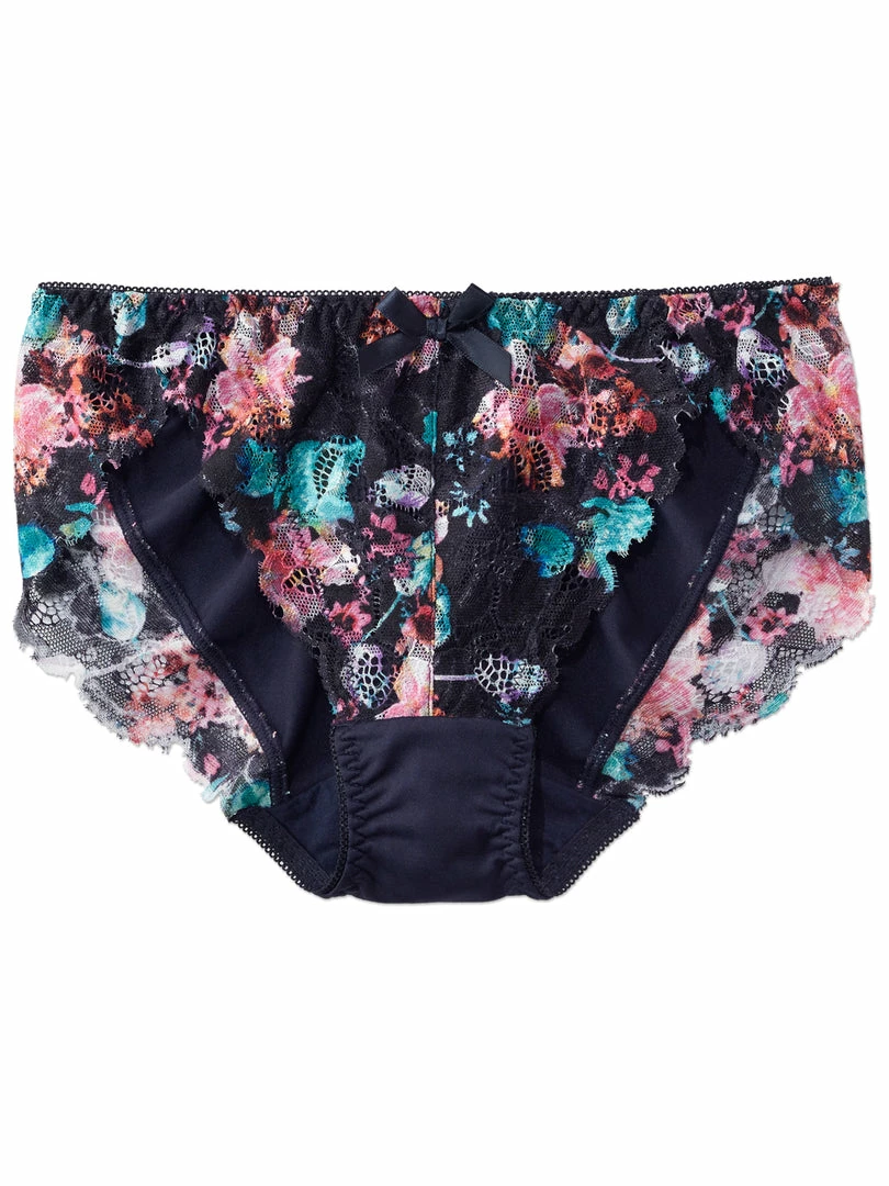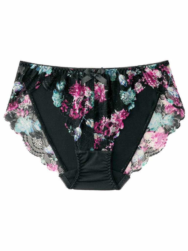 A sexy Bikini Panty in floral lace and sparkling satin. A ribbon detail on the front for a feminine look. The seams around the legs are trimmed in lace, so you’ll get a clean fit and no panty line even when wearing tight pants or a skirt.