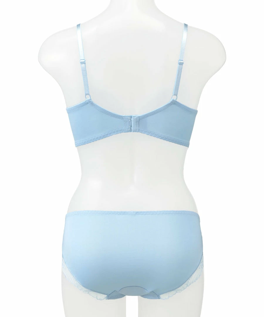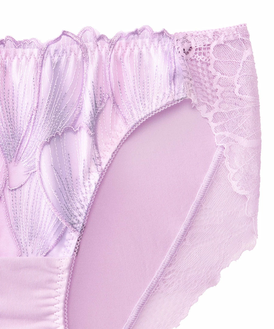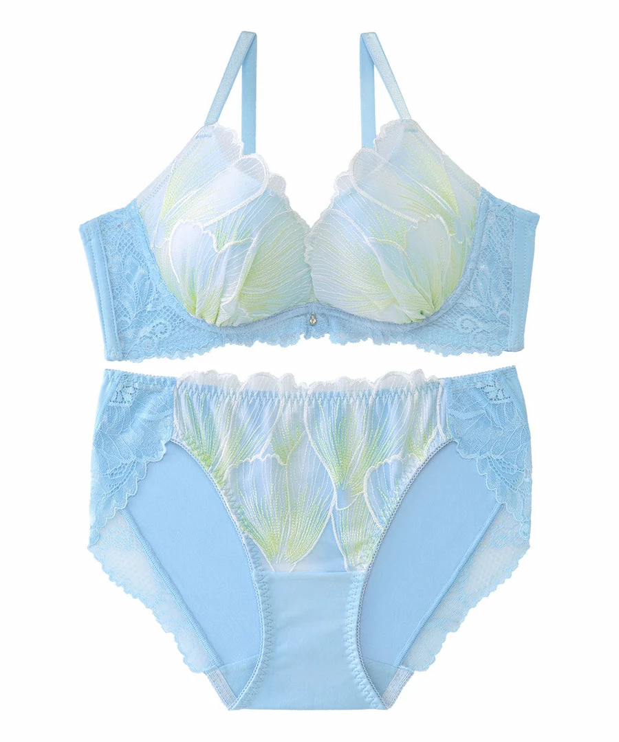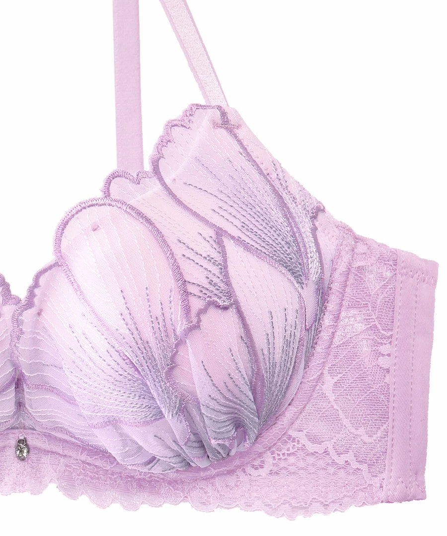 This side support bra set is made with beautiful and delicate embroidered lace that has an appearance similar to that of a flower petal wrapped around the bust.
