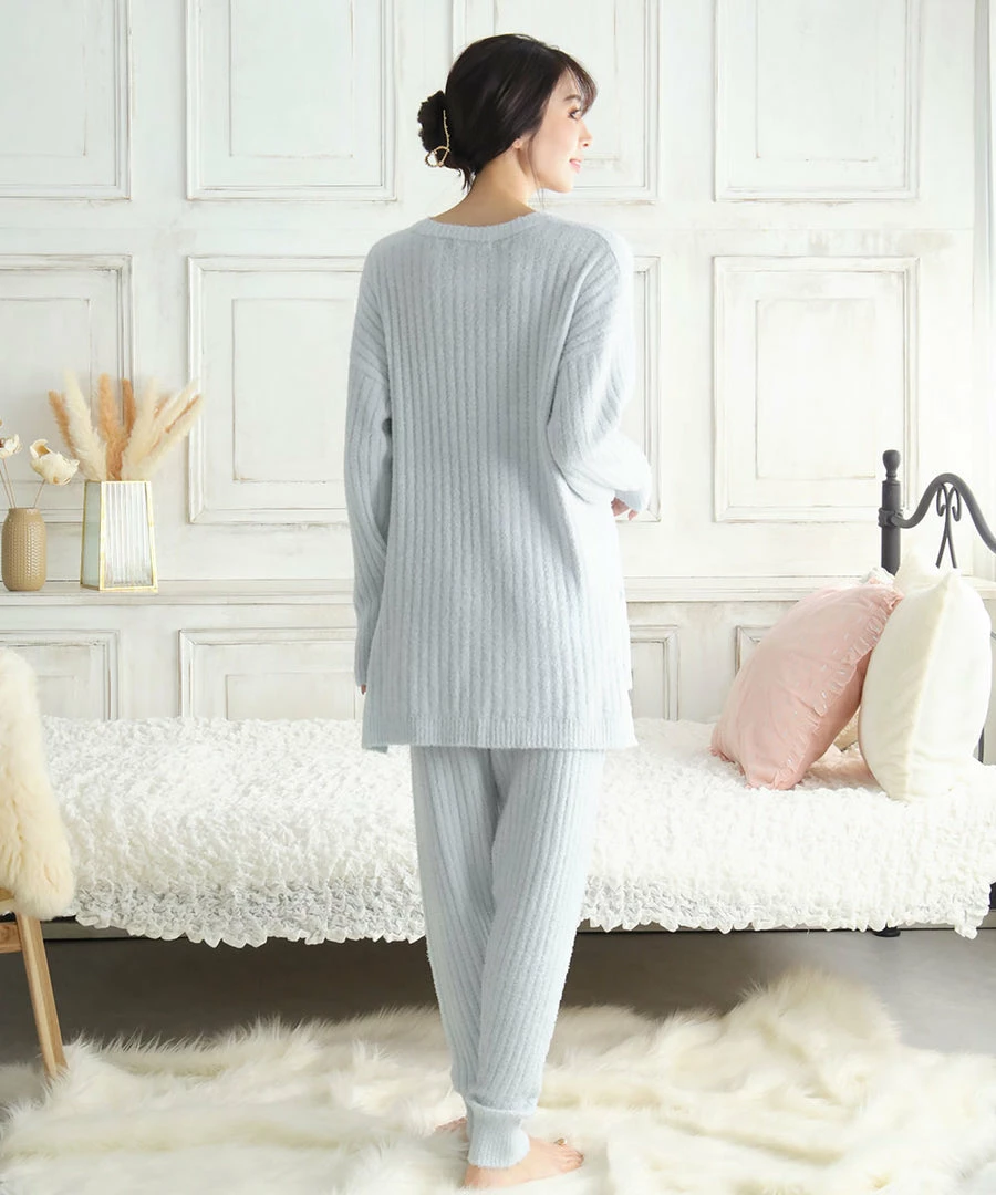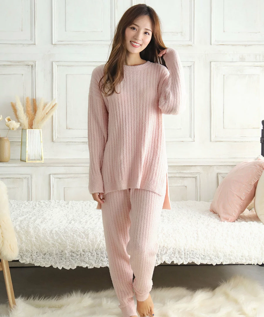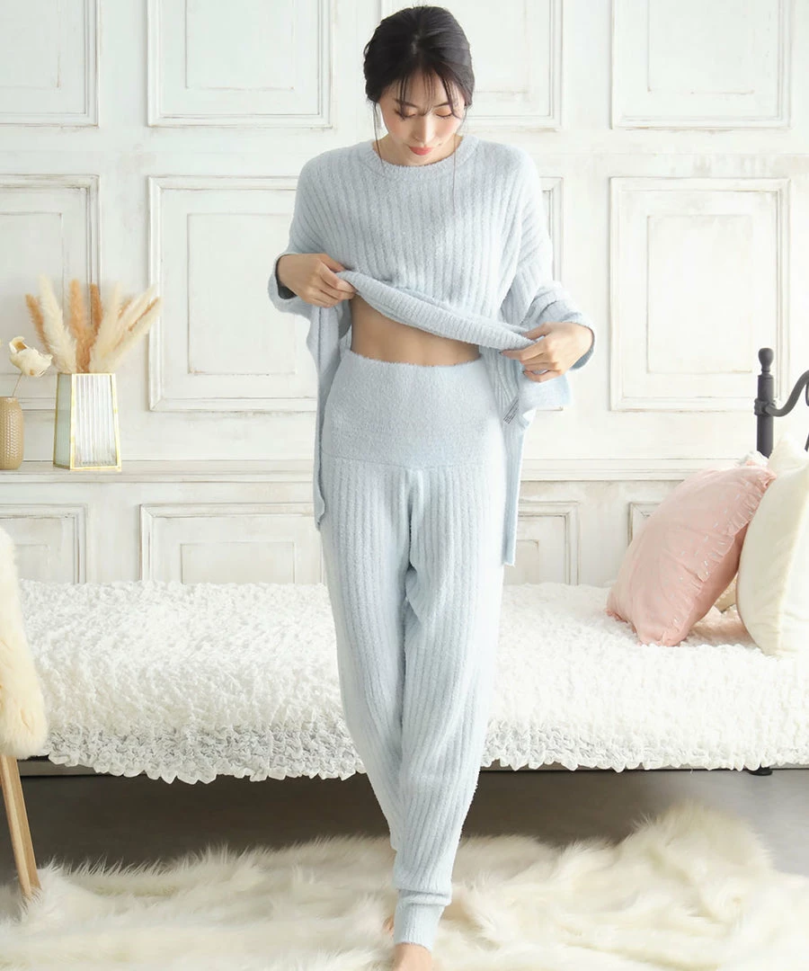 Top and bottom set with a seasonal, fluffy-textured knitted belly warmer. With its moderately thick texture and sizing that gives it a feminine look, this item is sure to be slimming!