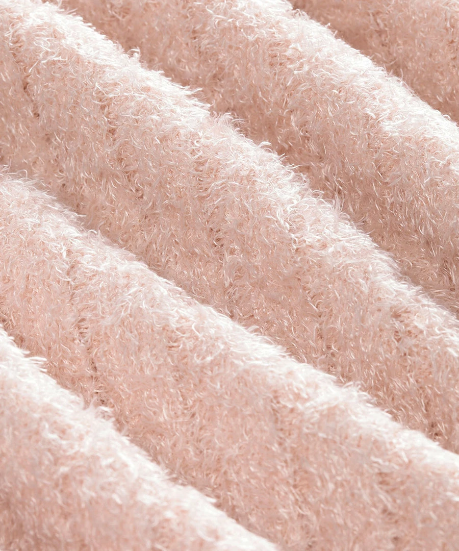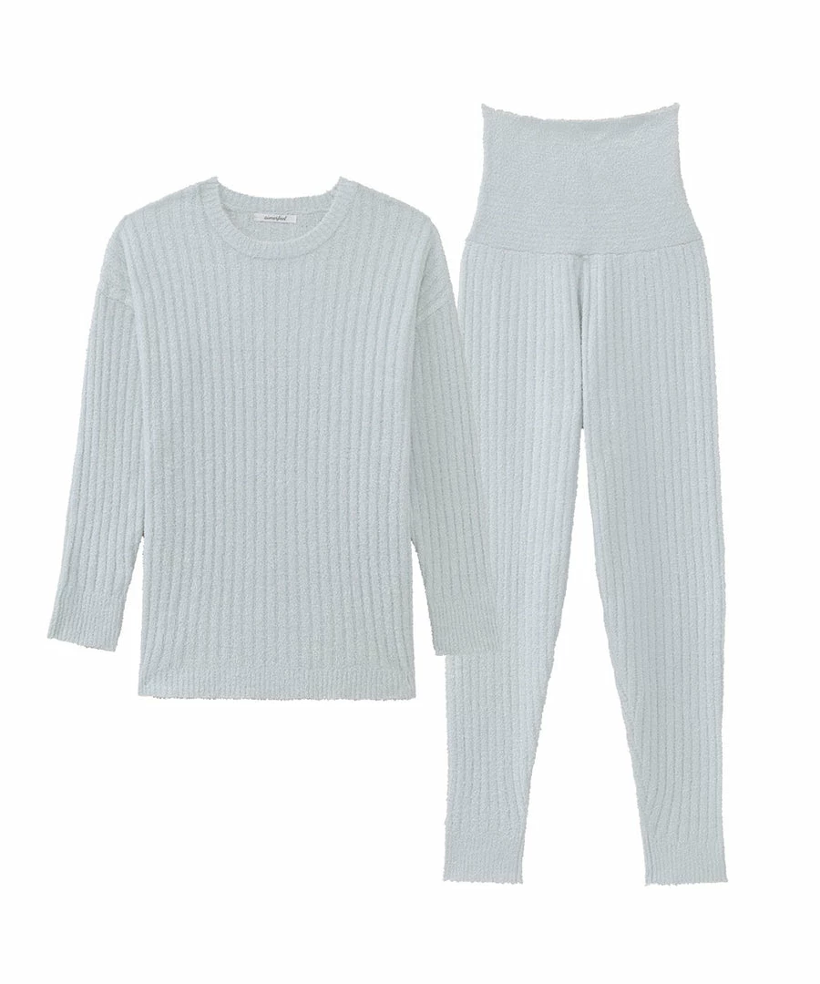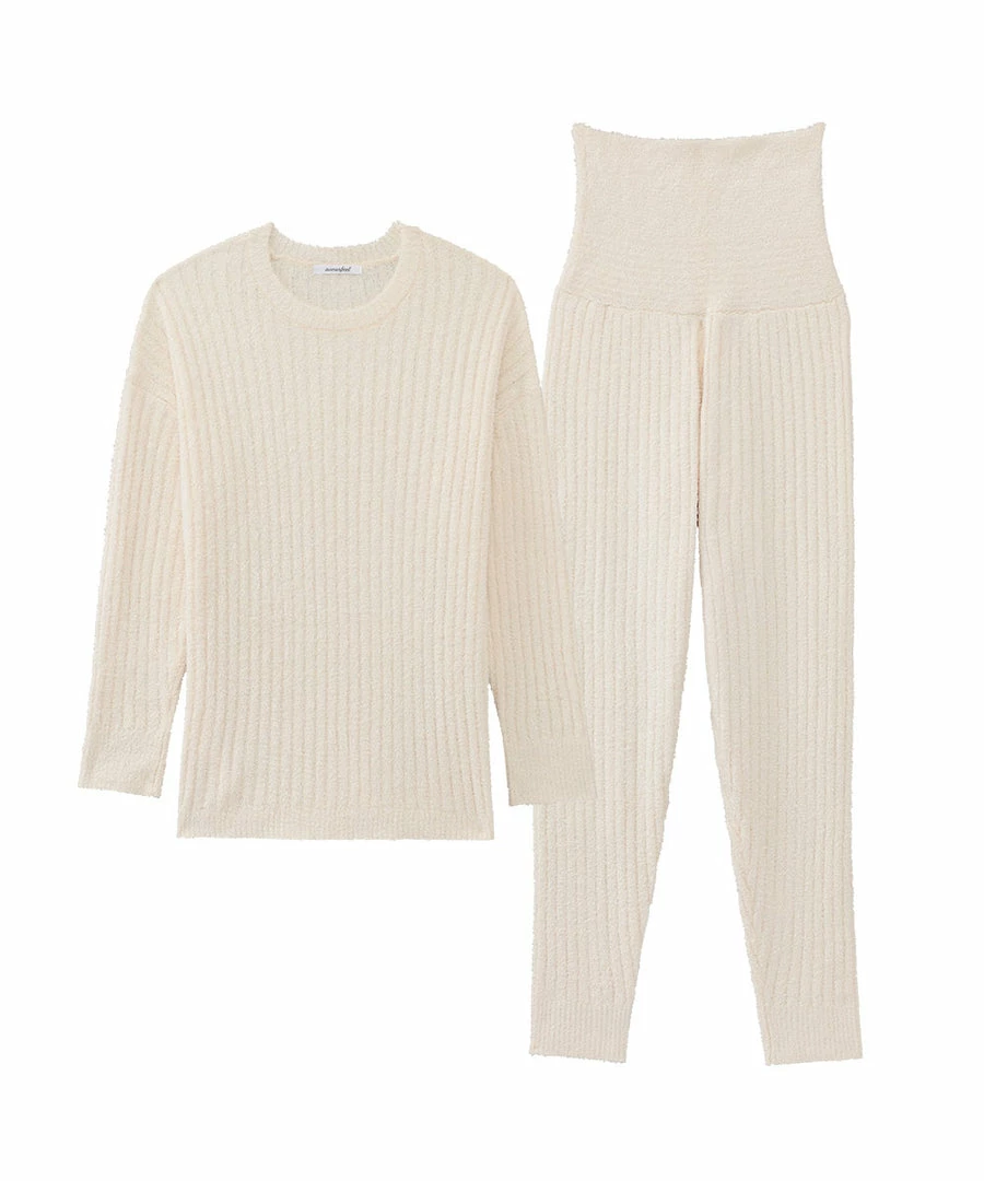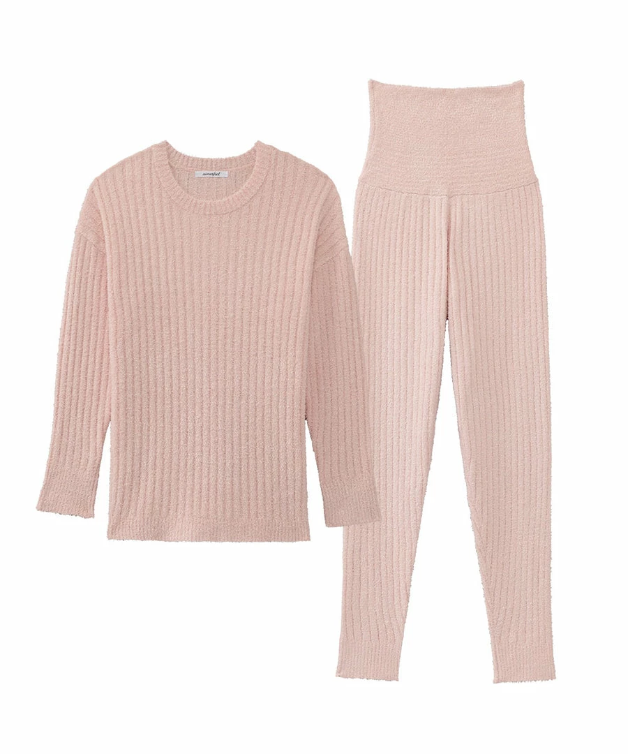 Top and bottom set with a seasonal, fluffy-textured knitted belly warmer. With its moderately thick texture and sizing that gives it a feminine look, this item is sure to be slimming!