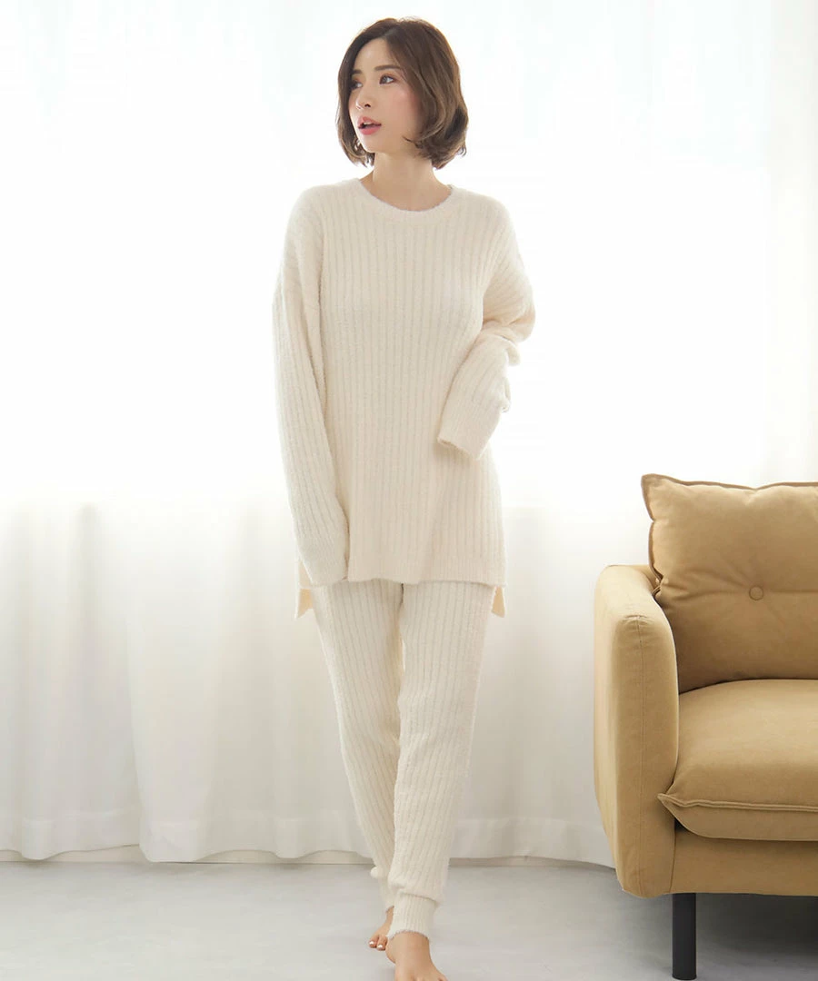 The top is long enough to hide your buttocks, while the pants both cover up your figure and securely envelop your waist to provide effective protection against the cold. The expressive ribbed knitting make this a very trendy item!