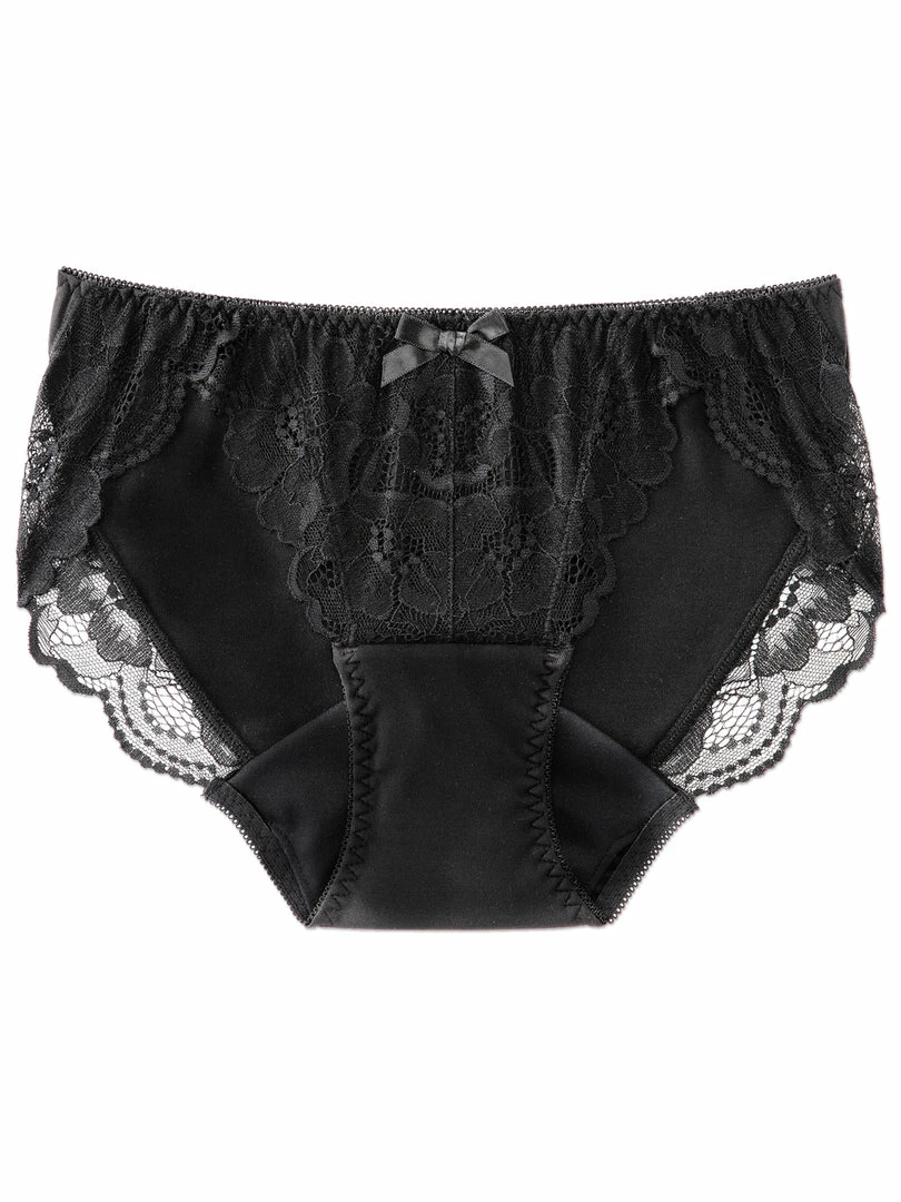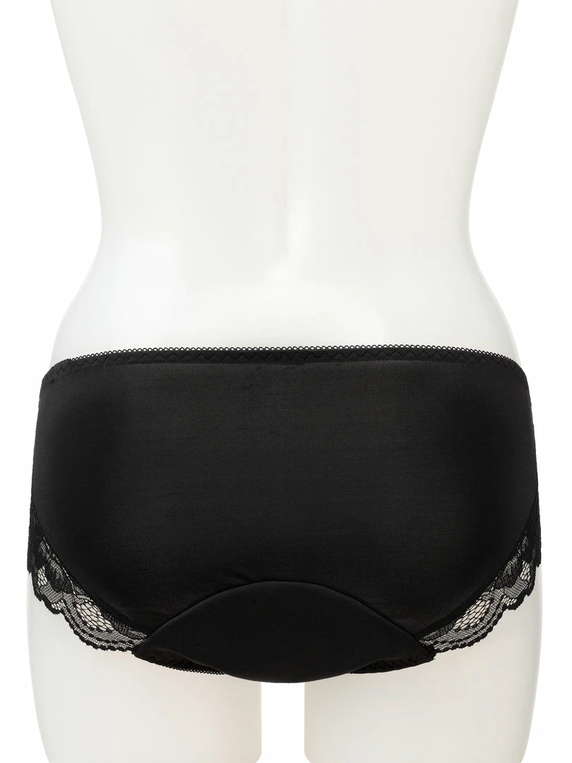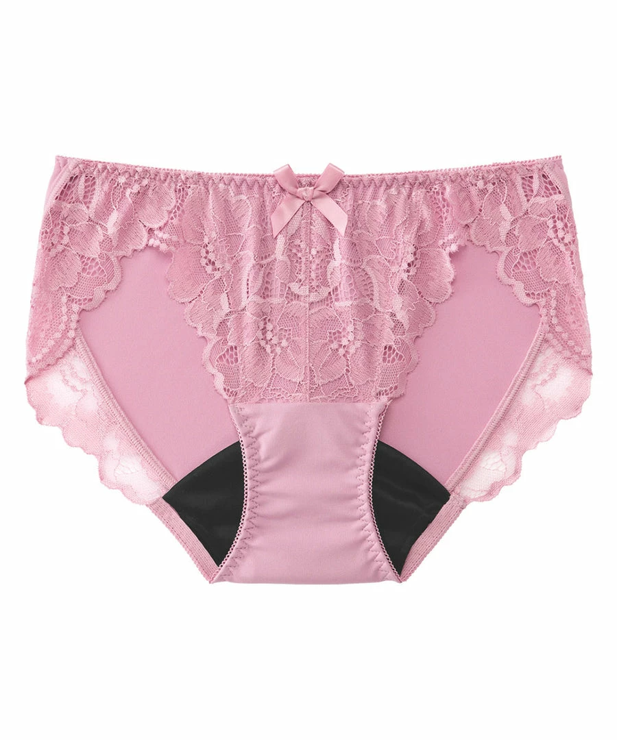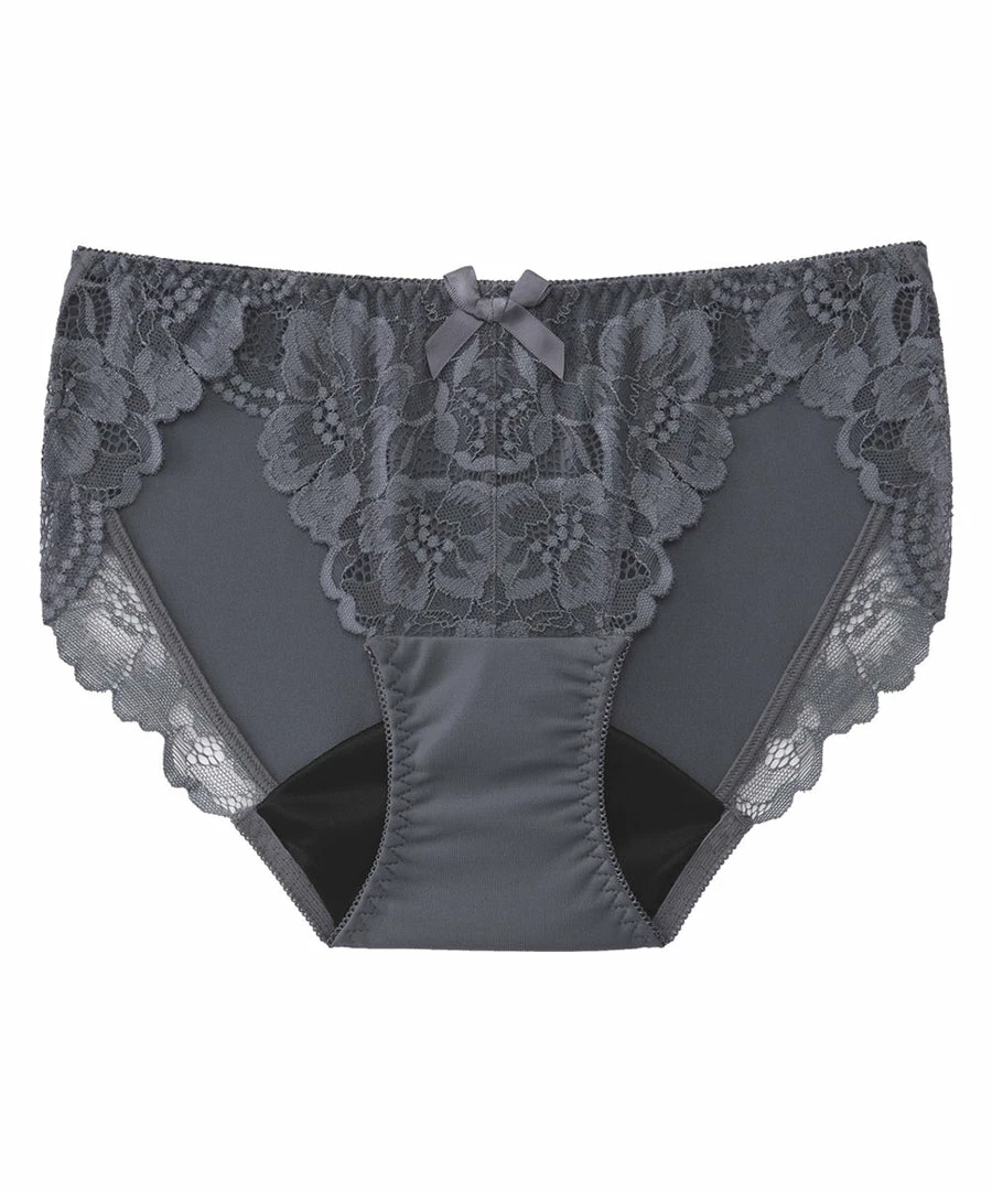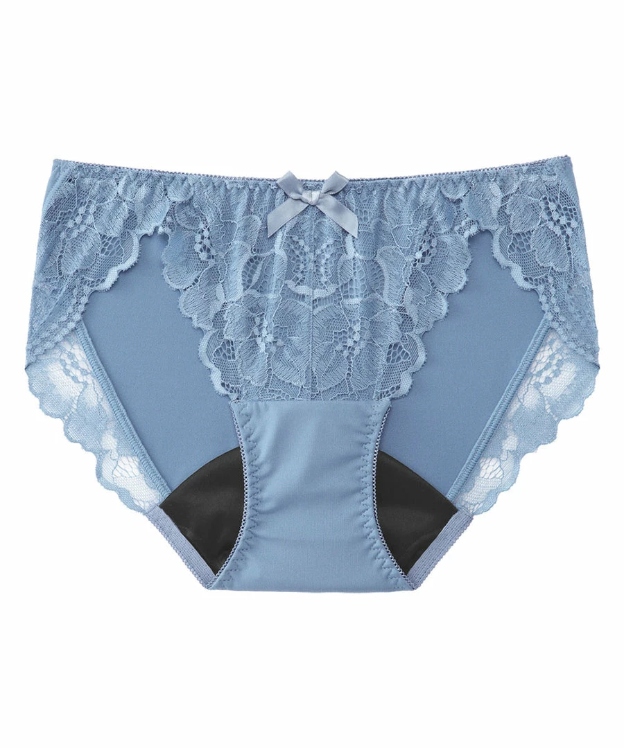 Lace period panty. A nice feature is the lace that extends to the leg openings, so they are unlikely to show through your clothes! The double crotch structure with overlaid waterproof fabric reduces anxiety about leakage. Designed to wear with sanitary napkins.