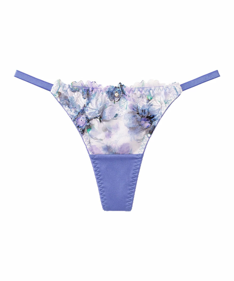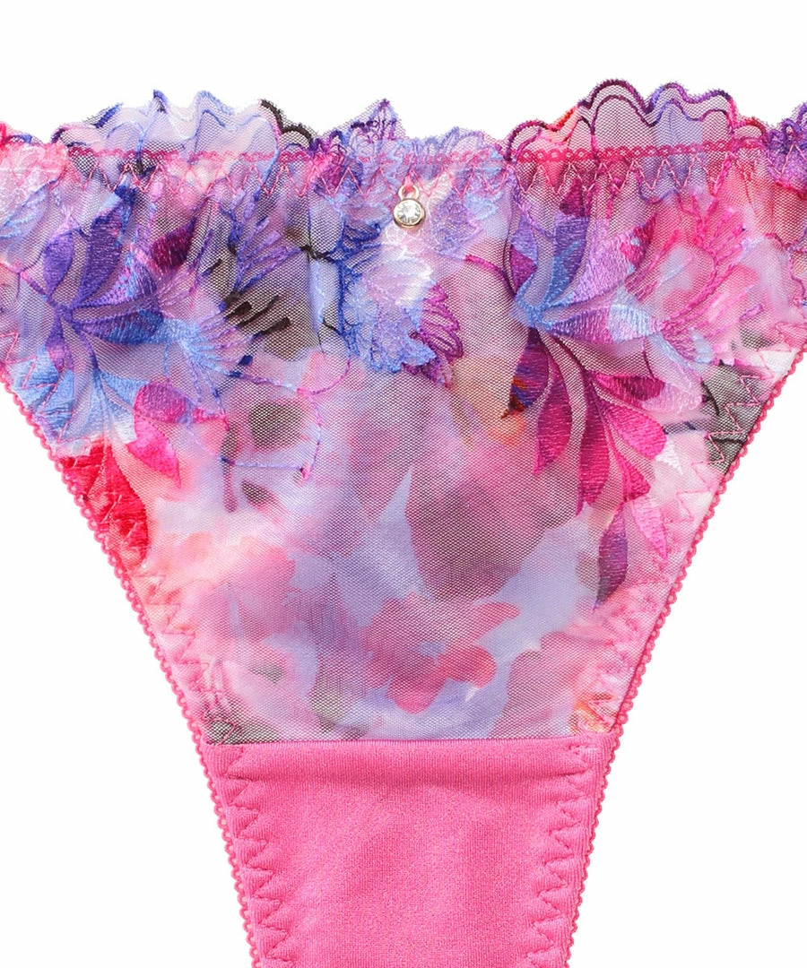 Thong Panty in a colorful flower print with shiny lustrous embroidery.