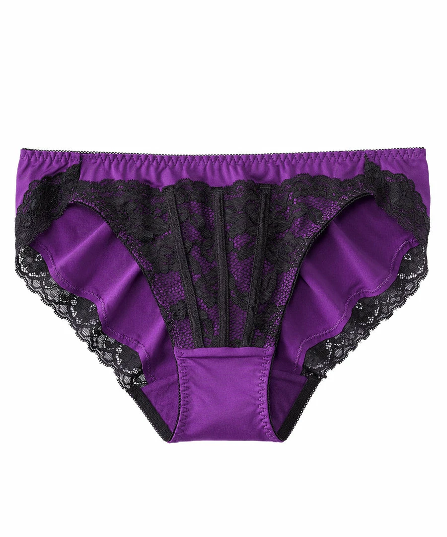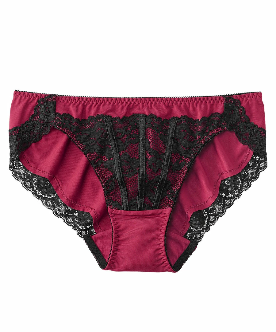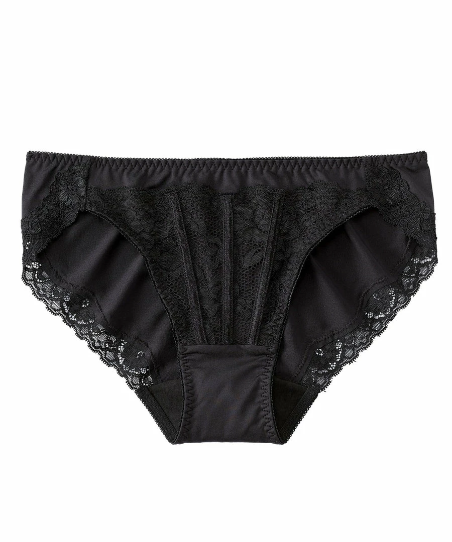Adult sexy bikini panty with a design that incorporates lines over black lace.