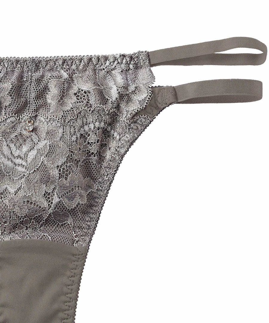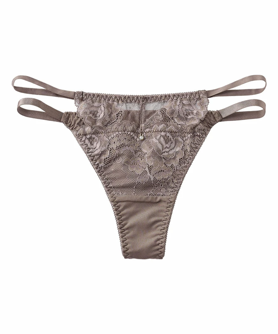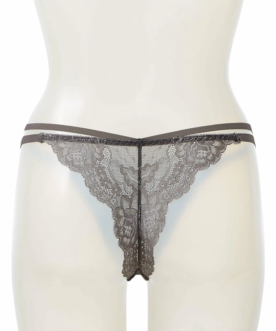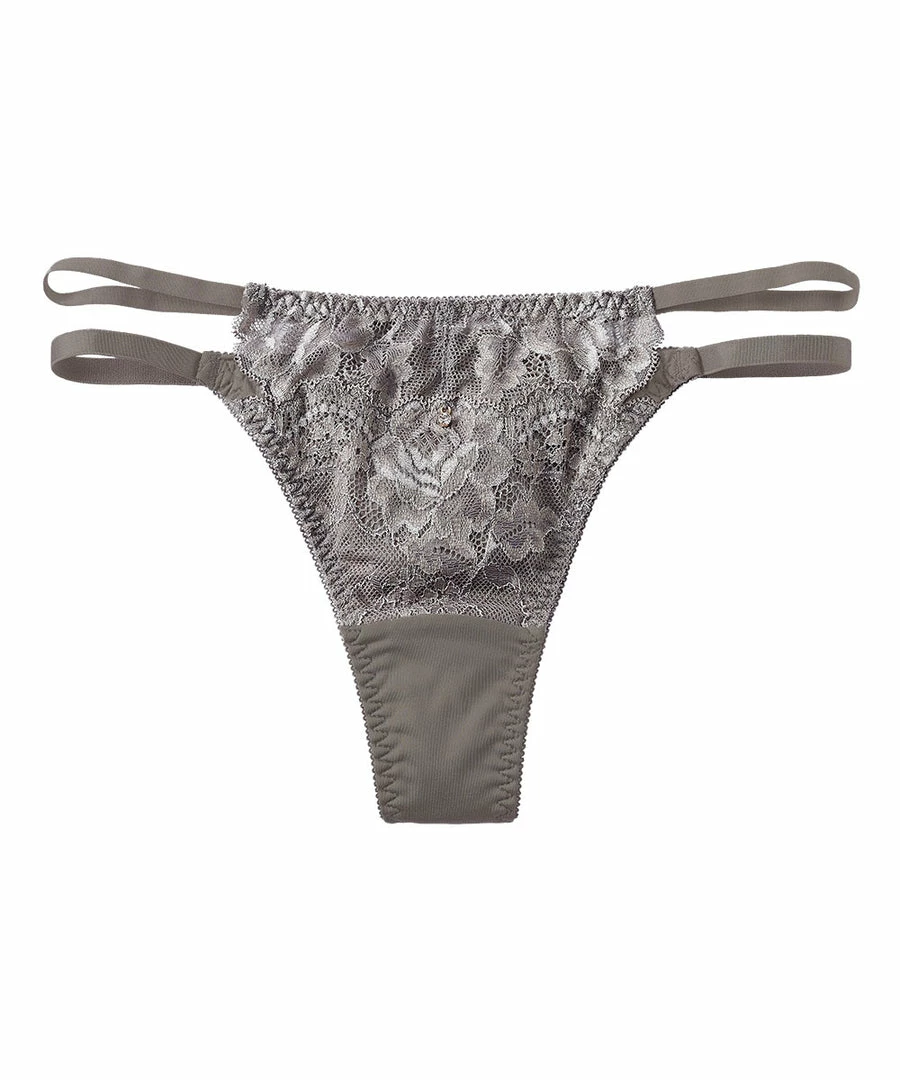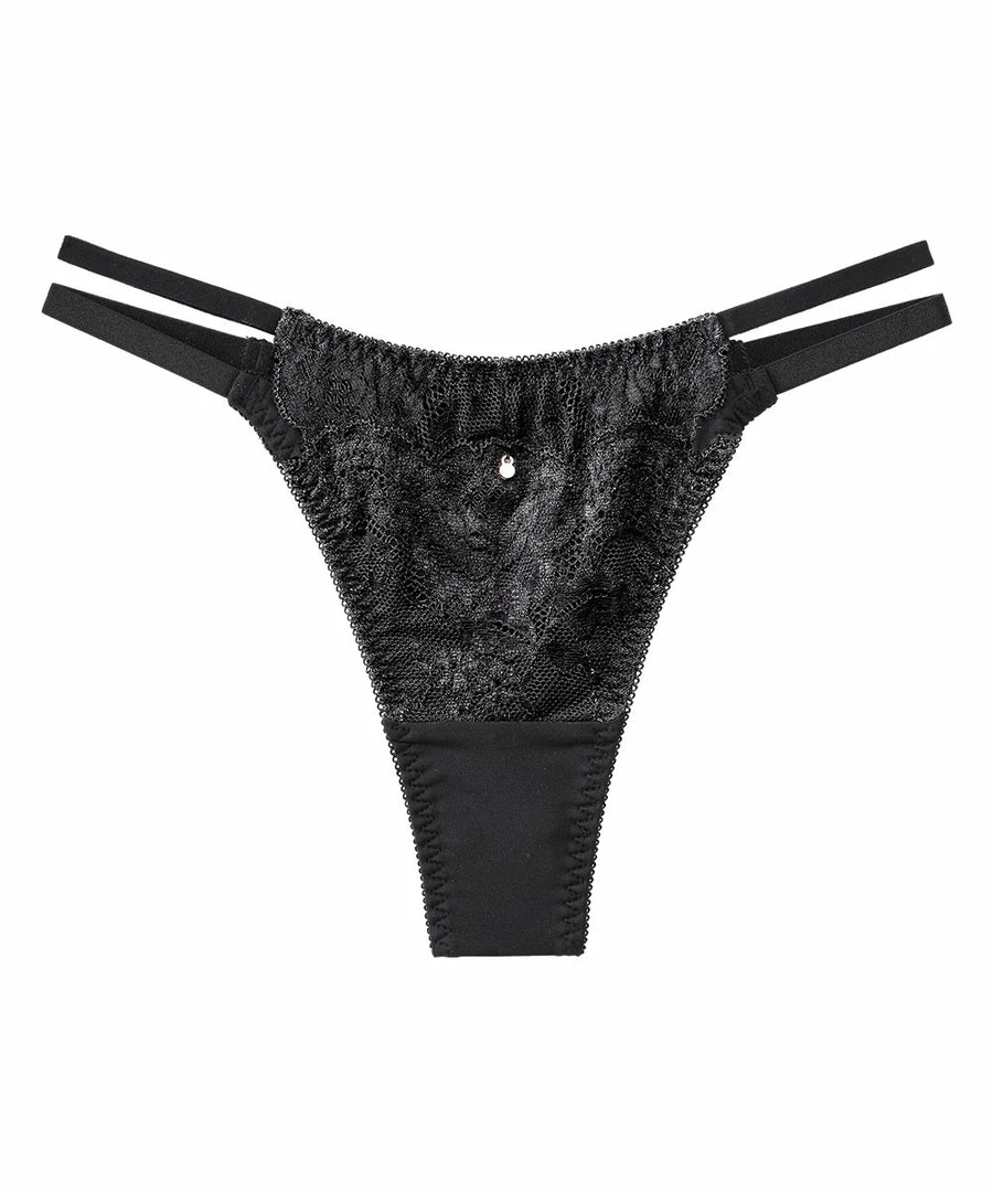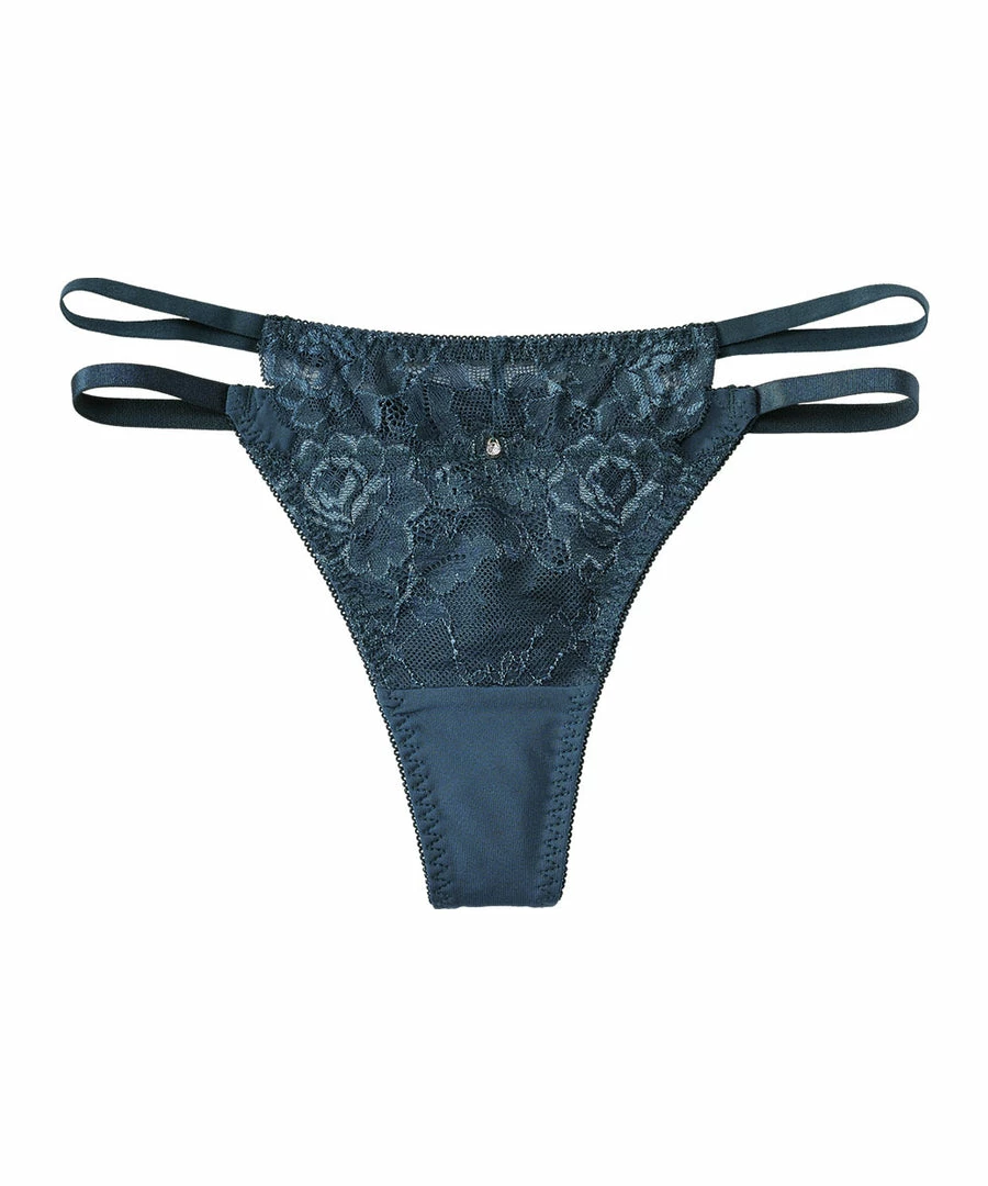 This sexy thong panty is designed with an opening in the lace around the waist and the dainty use of cords on both sides.