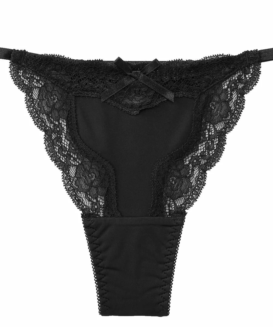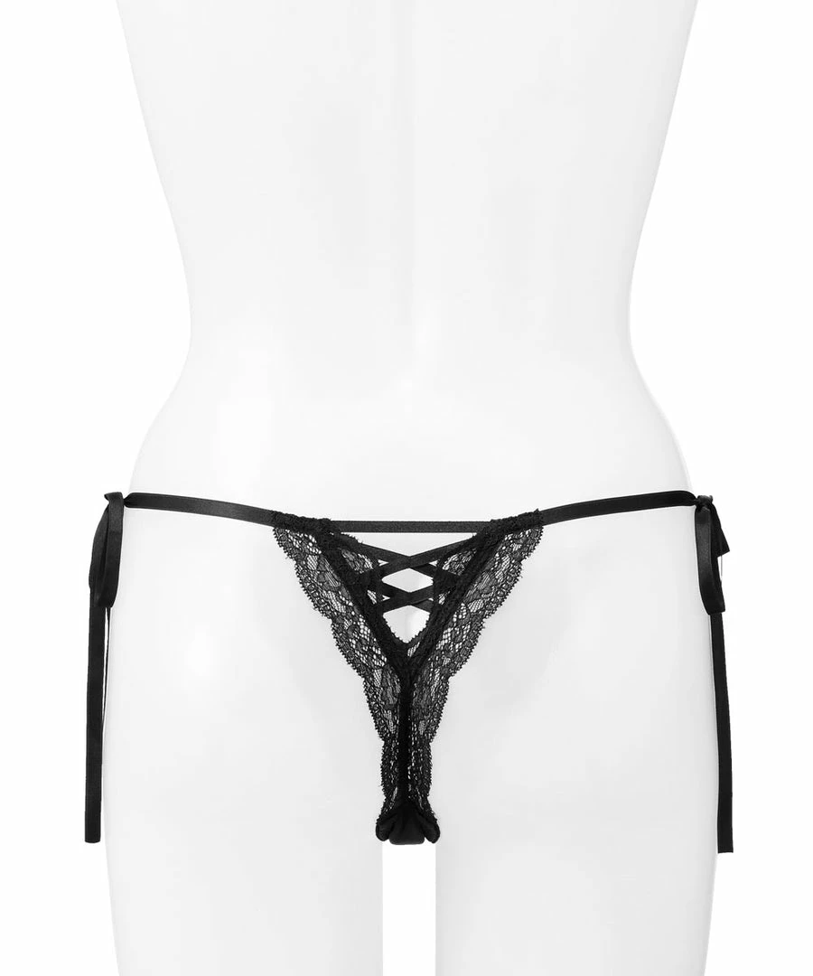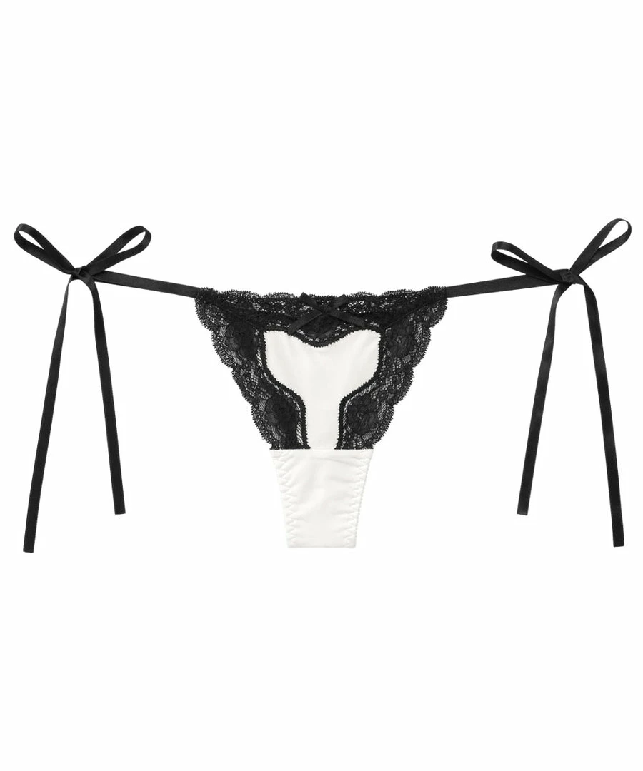 A ribbon and black lace add sugar and spice to this sexy side tie thong panty.