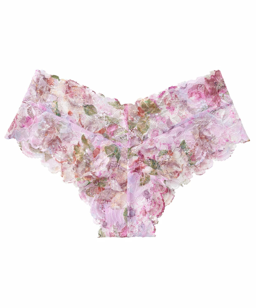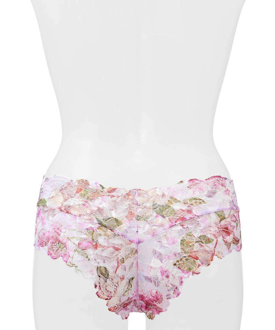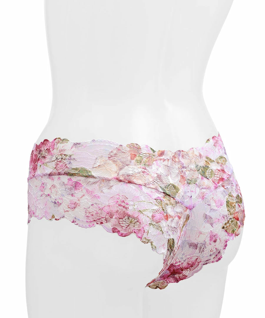 Elegant floral lace cheeky panty with colorful flowers that bring to mind a spring garden. A design that conveys a sense of sweetness amidst the elegance.