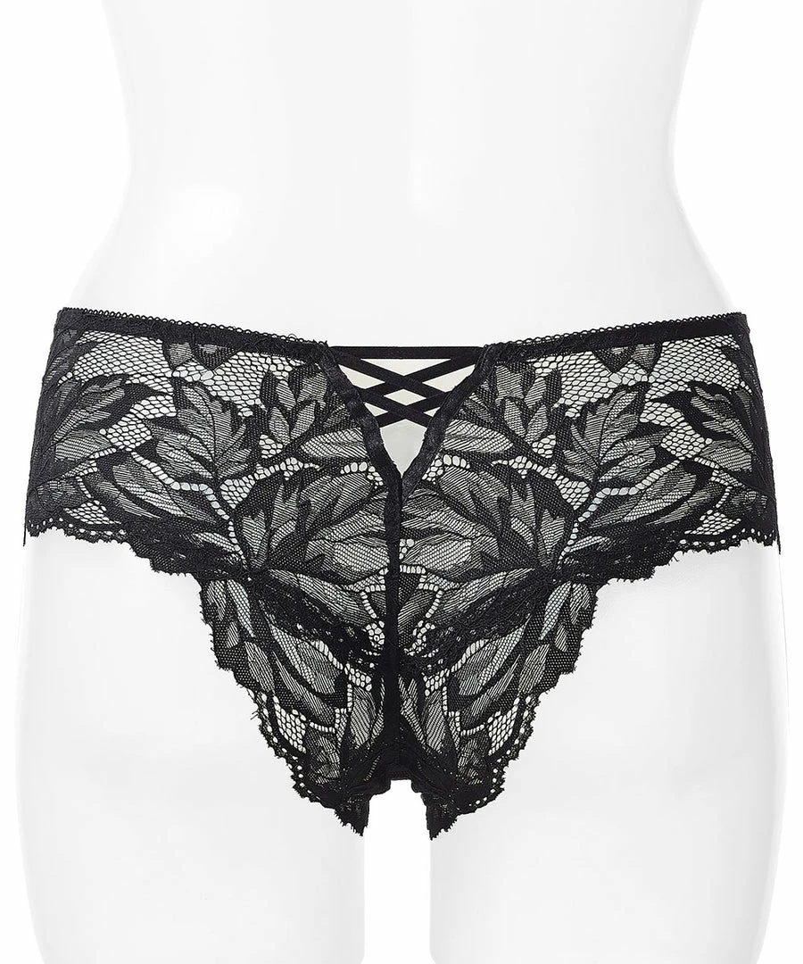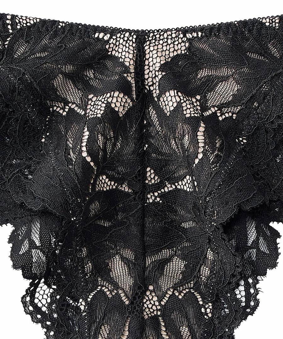 Sexy thong panty whose body fabric is overlaid with flower-print lace.