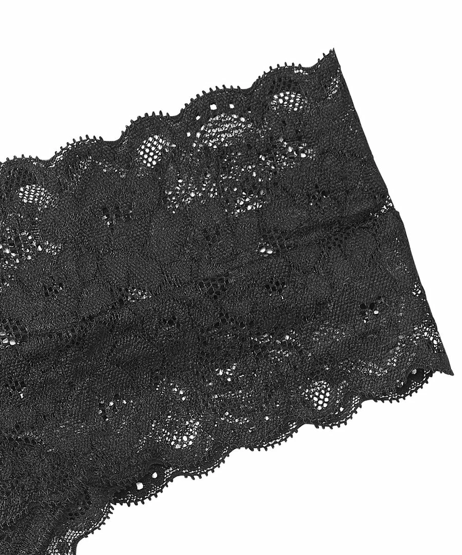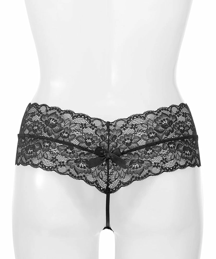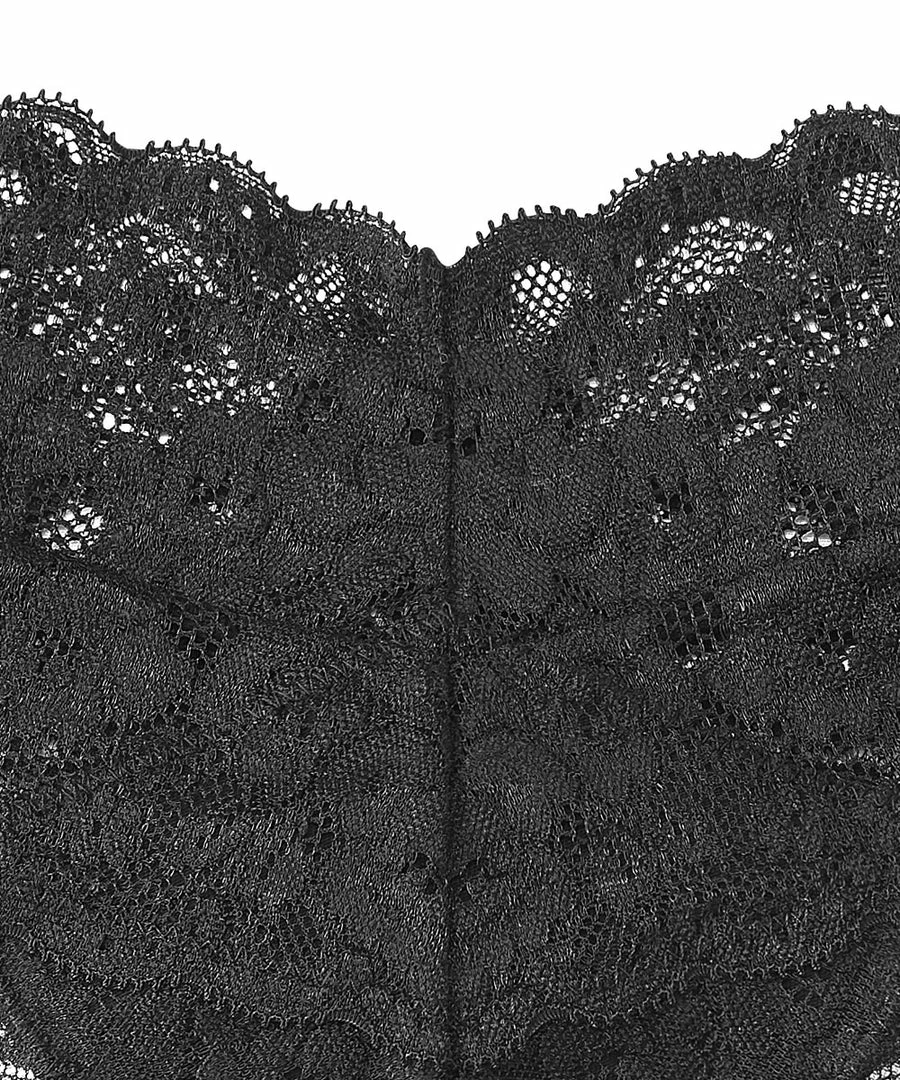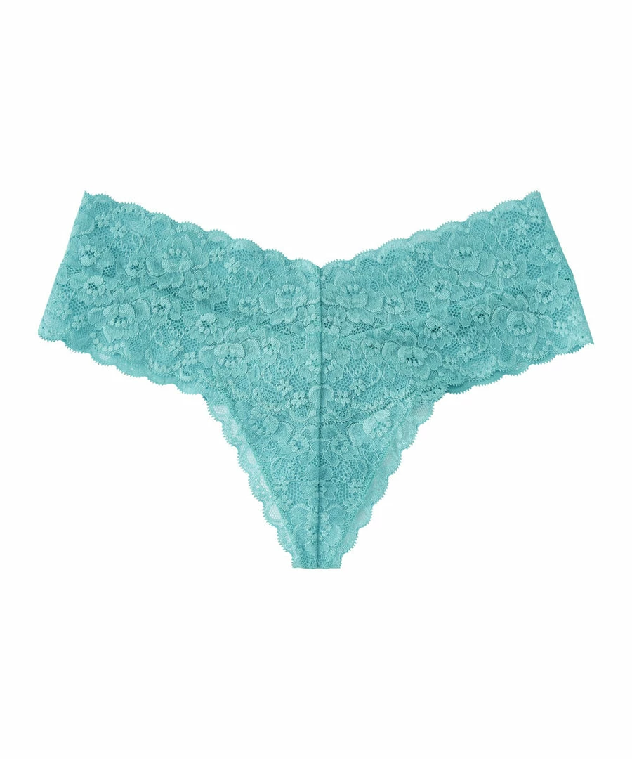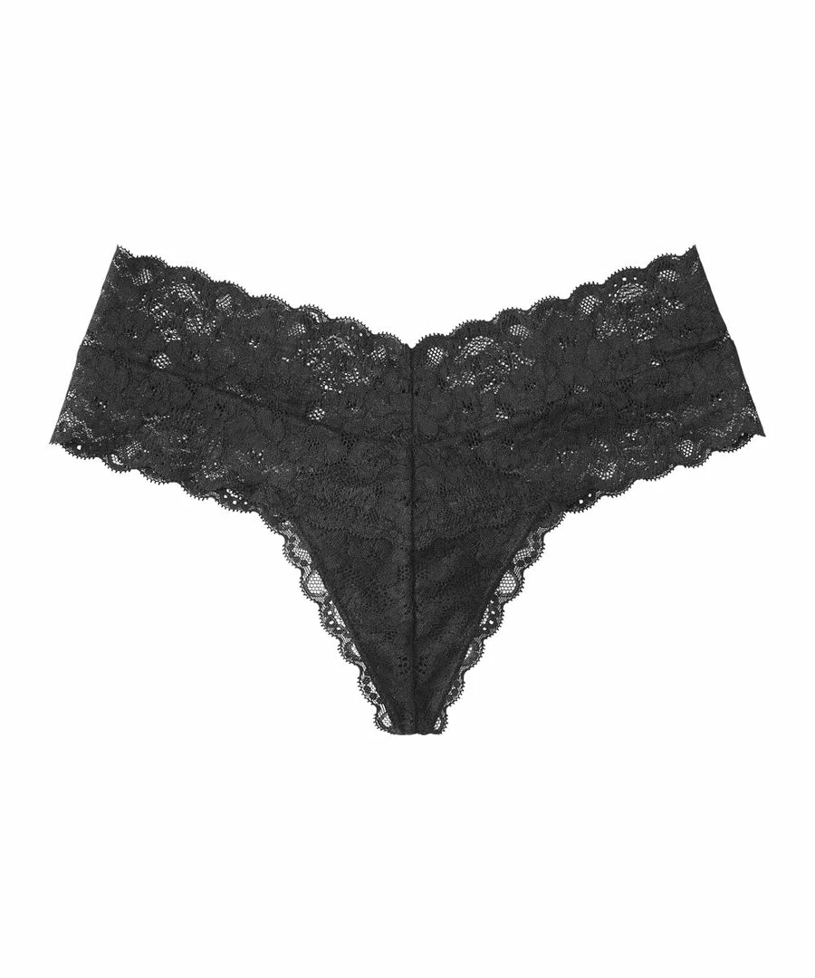 A sexy thong Panty made with highly elastic flower lace and a hit of transparency. From the front, it has the silhouette of the Cheeky Panty. The back is accented by a small ribbon, and reveals bare skin.