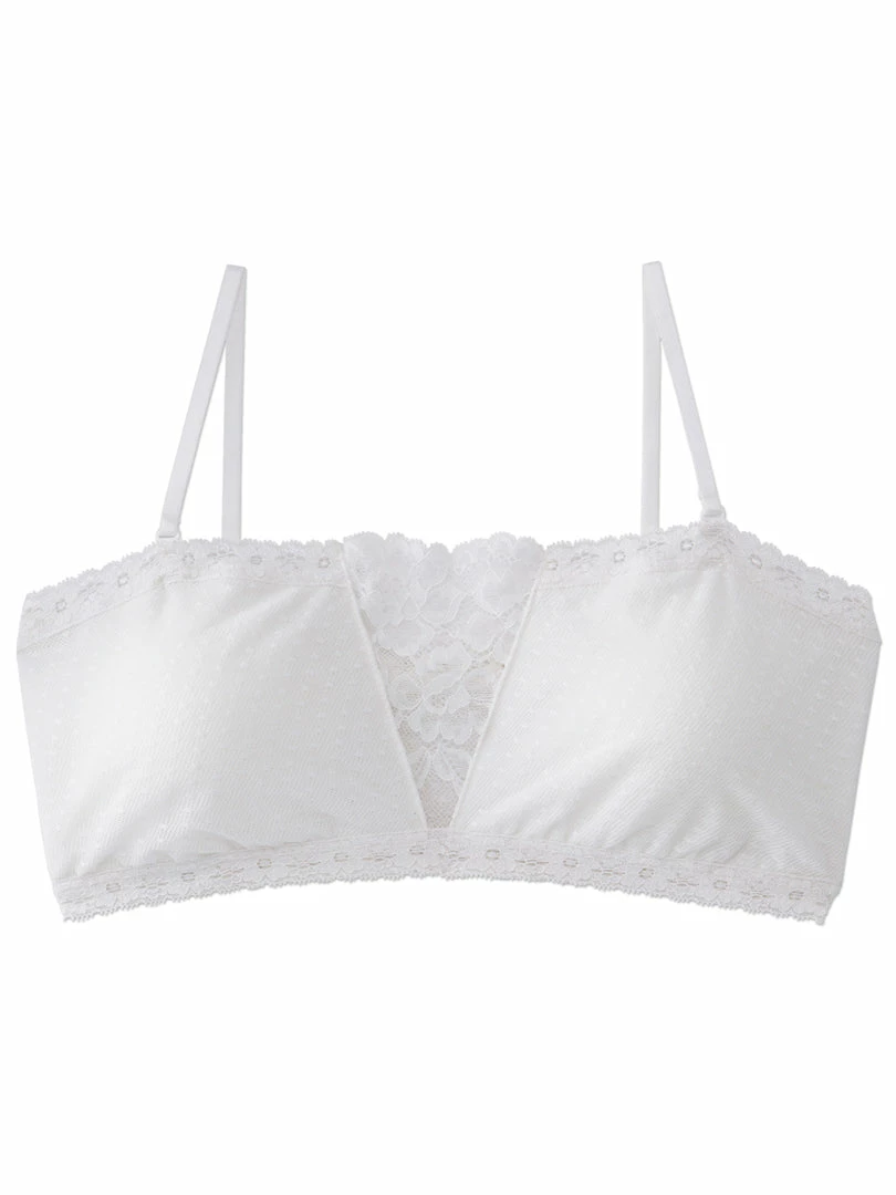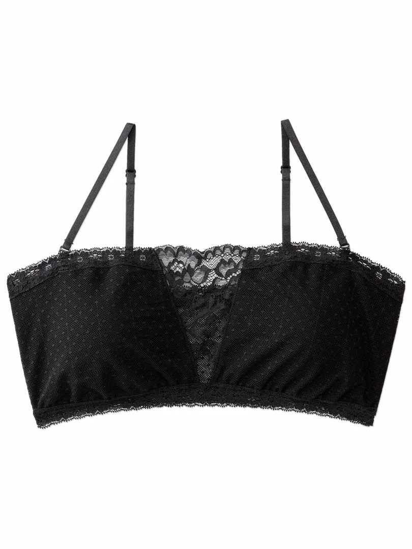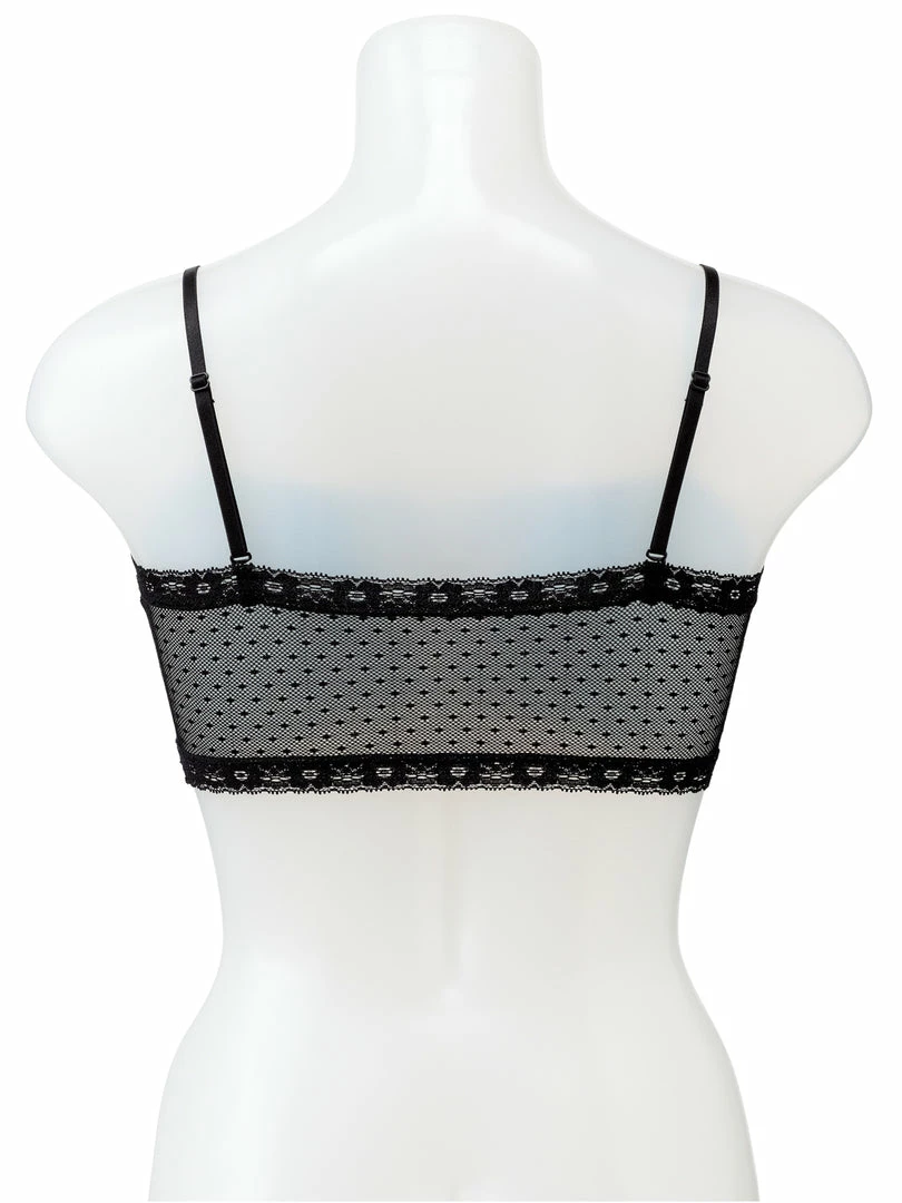 A bandeau style bra resembling a tube top with cups wrapped in dot print tulle. Cleavage shows through the front lace, making it cute and a bit sexy. Wear it as a “show off” bra with an open-front top!