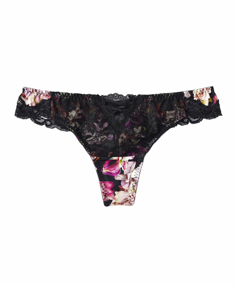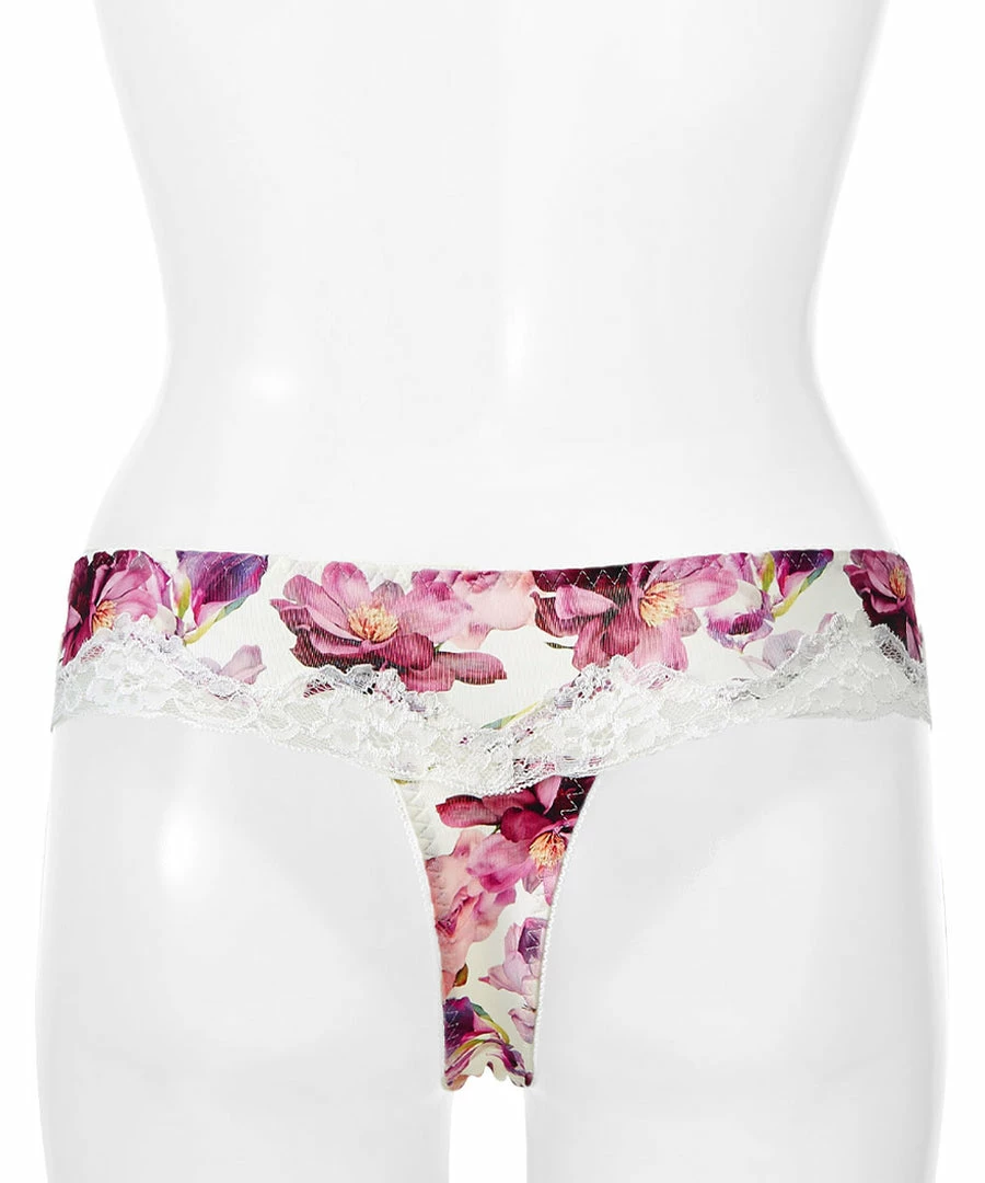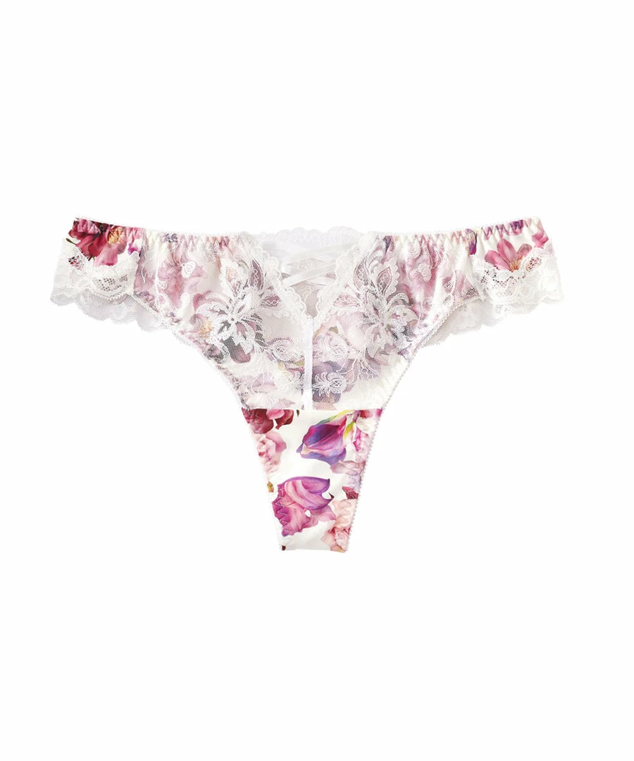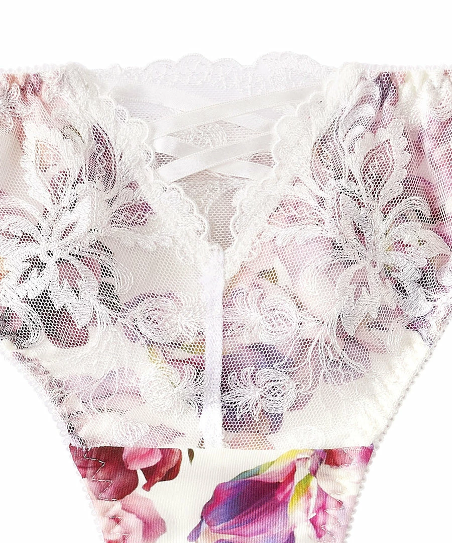 These panties are made from an elegant flower print fabric, plus the added touches of a crossed ribbon and lace.