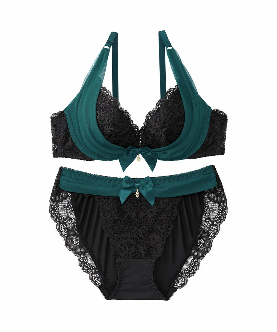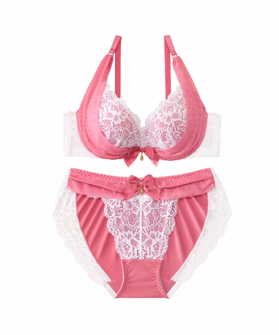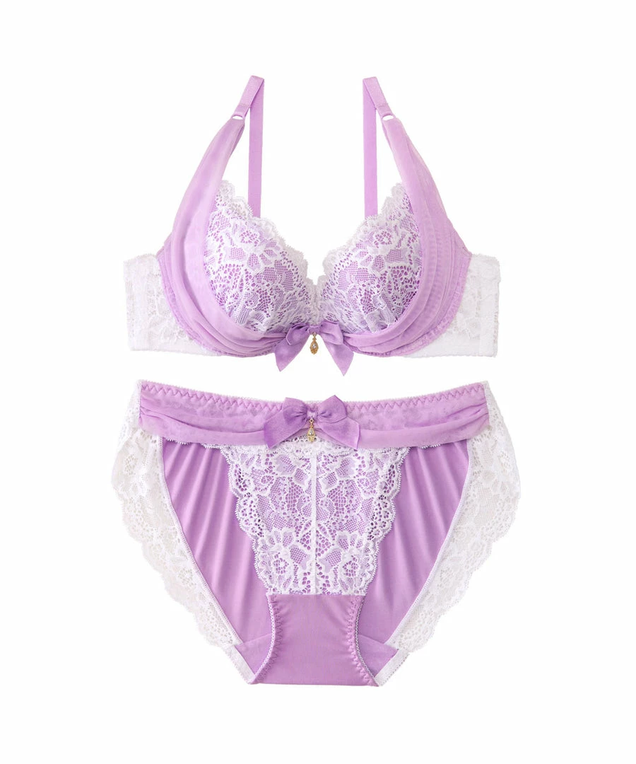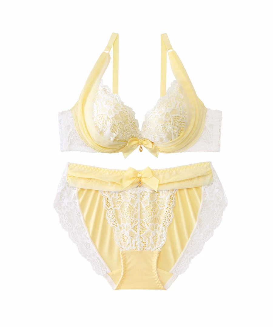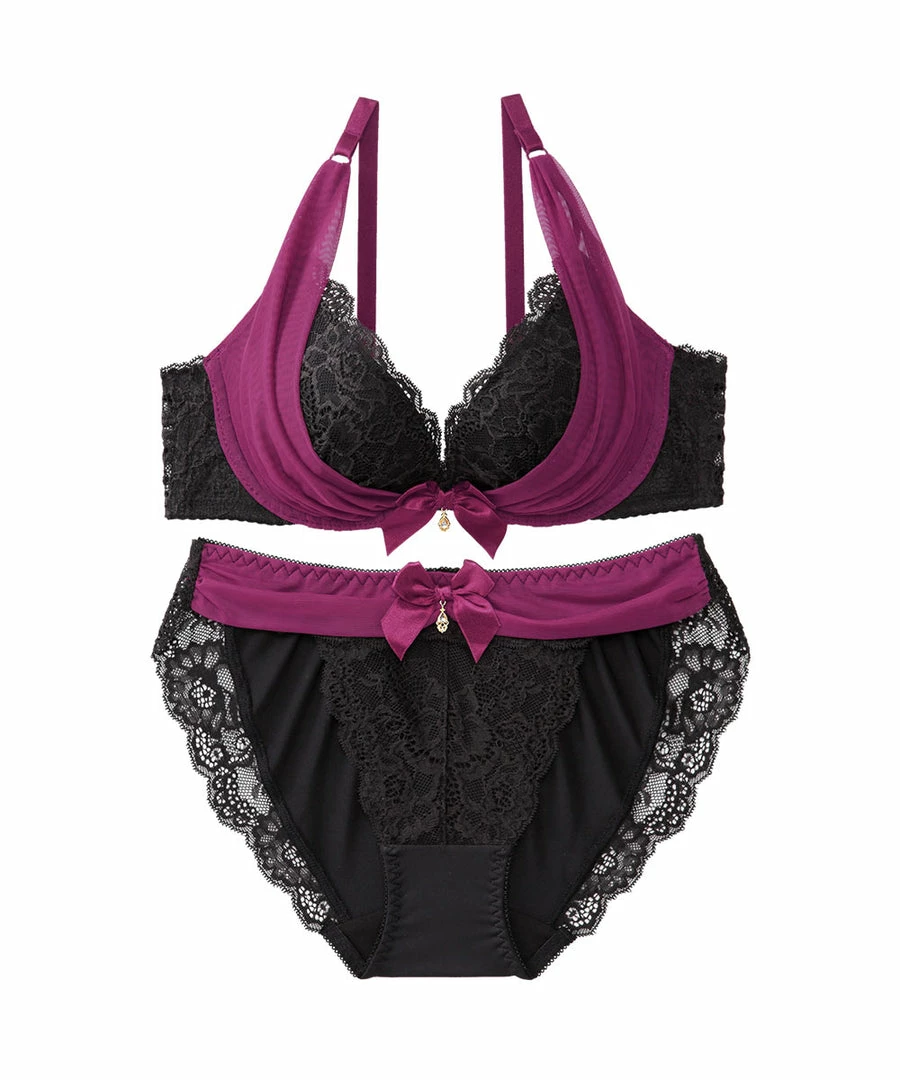 A sexy bra with gorgeously elegant decorations on the cups. A “power net Eextends upward from the bottom of the cups, pushing the breasts upward to make them look fuller.
