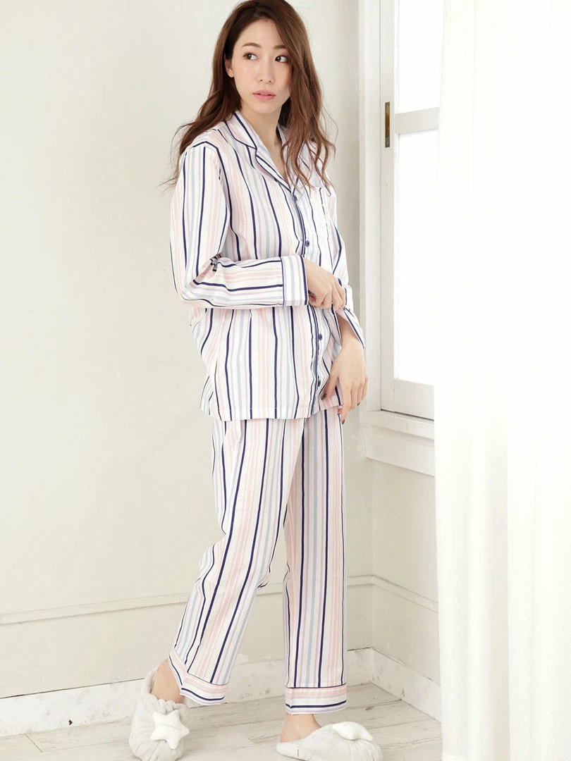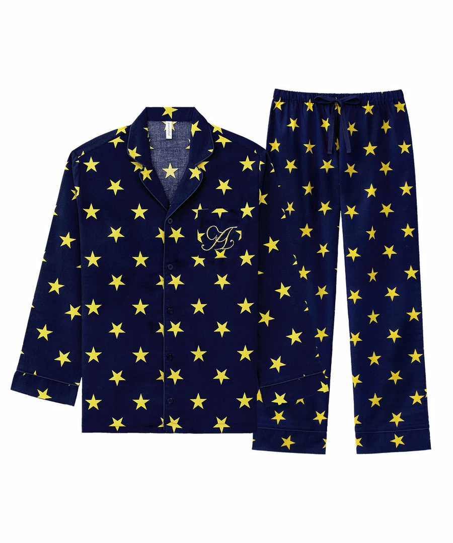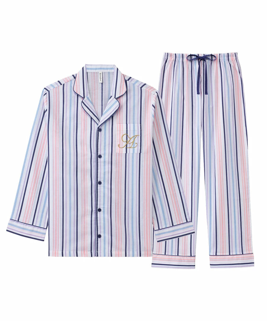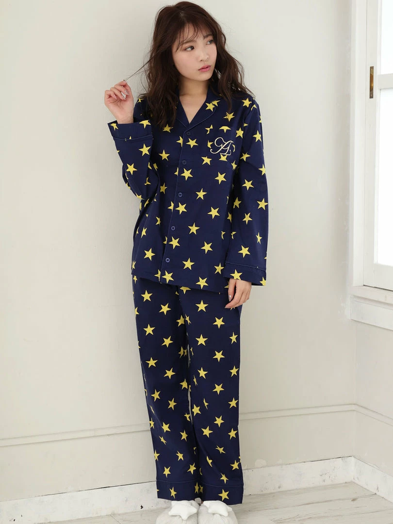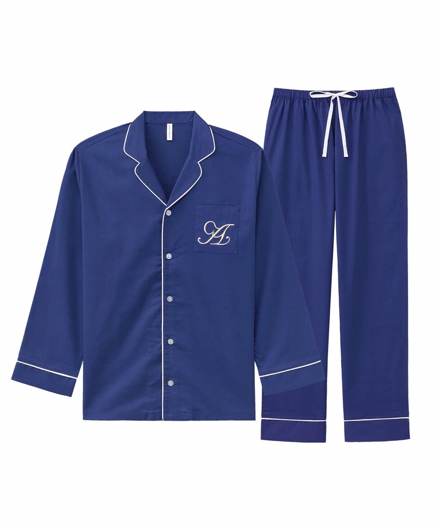 Pajama top and bottom set is soft and gentle on the skin! Because it is 100% cotton, it promises a quality, comfortable sleep. Gold embroidery are stylish! These cute pajamas also make a present that’s sure to please.