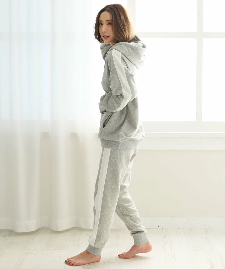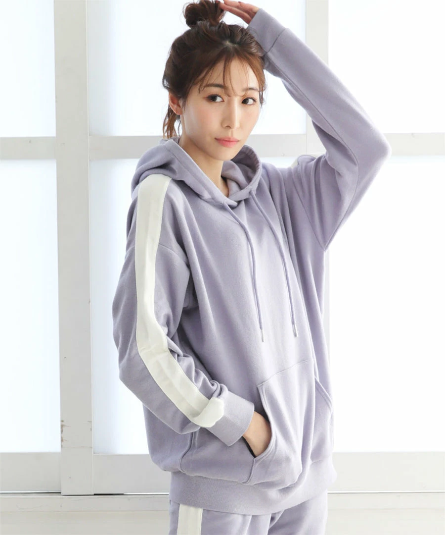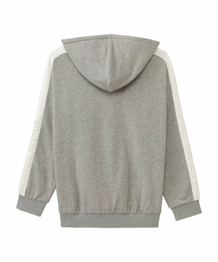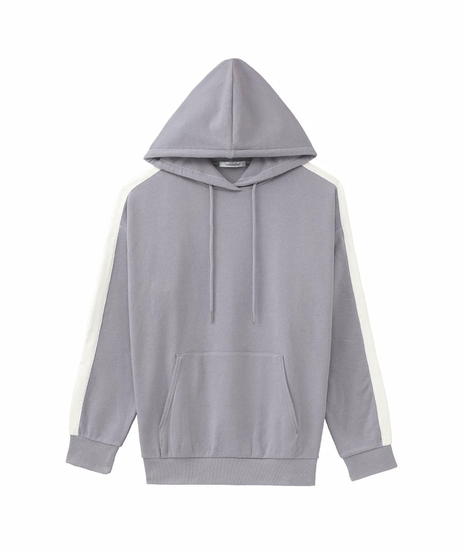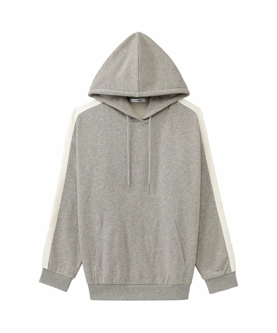 A casual hoodie with lines on its side that add a decorative accent.
