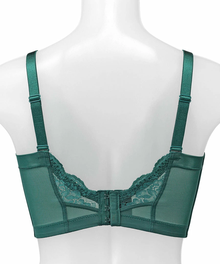 Our finest bust-shaping bra, corrective and even more comfortable, is now available in plus sizes. It gathers any fleshy areas from your underarms and back, bringing them to your bust to give you beautiful cleavage! The area under the cups is layered with mesh material to prevent them digging into the skin and create a gentle fit. Also, no rubber is used in the wide underbelt, avoiding any indent marks being left on your skin.