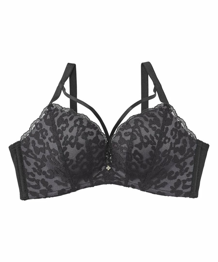The seamless cups are overlaid with leopard print lace, while cord lines that cross your cleavage and a diamond-shaped bijou really catch the eye.